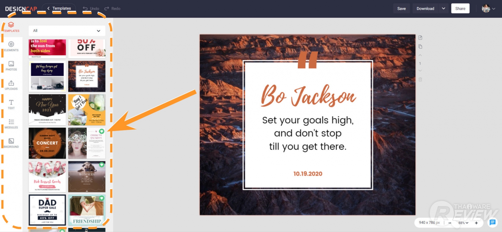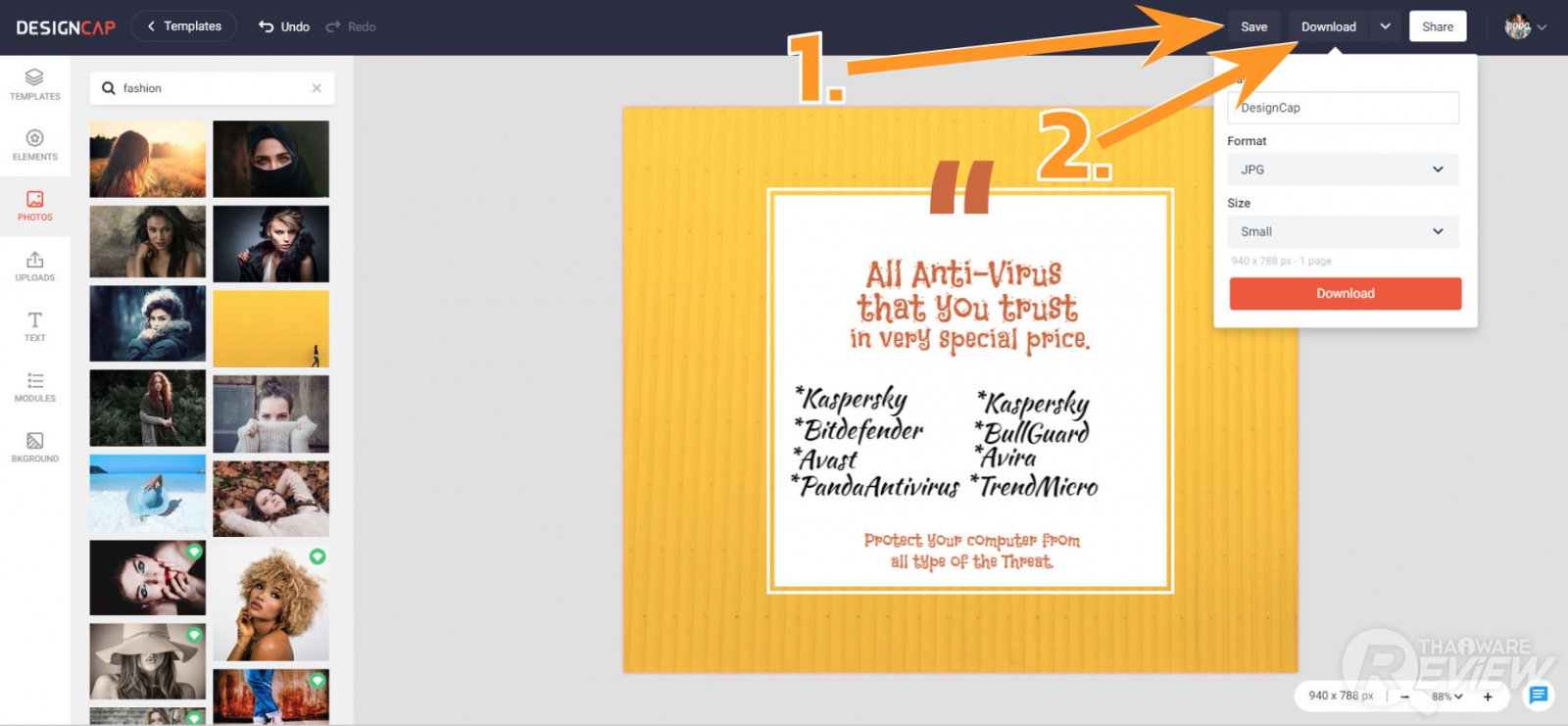 เมื่อปรับแต่งจนได้งานออกแบบที่พอใจแล้ว ให้คลิกที่ปุ่ม Save (หมายเลข 1.) เพื่อบันทึกงานออกแบบของเราเก็บไว้บนระบบของ DesignCap เพื่อเรียกมาปรับแต่งแก้ไขได้อีกในภายหลัง จากนั้นคลิกที่ปุ่ม Downolad (หมายเลข 2.) เพื่อดาวน์โหลดไฟล์ภาพของเรา