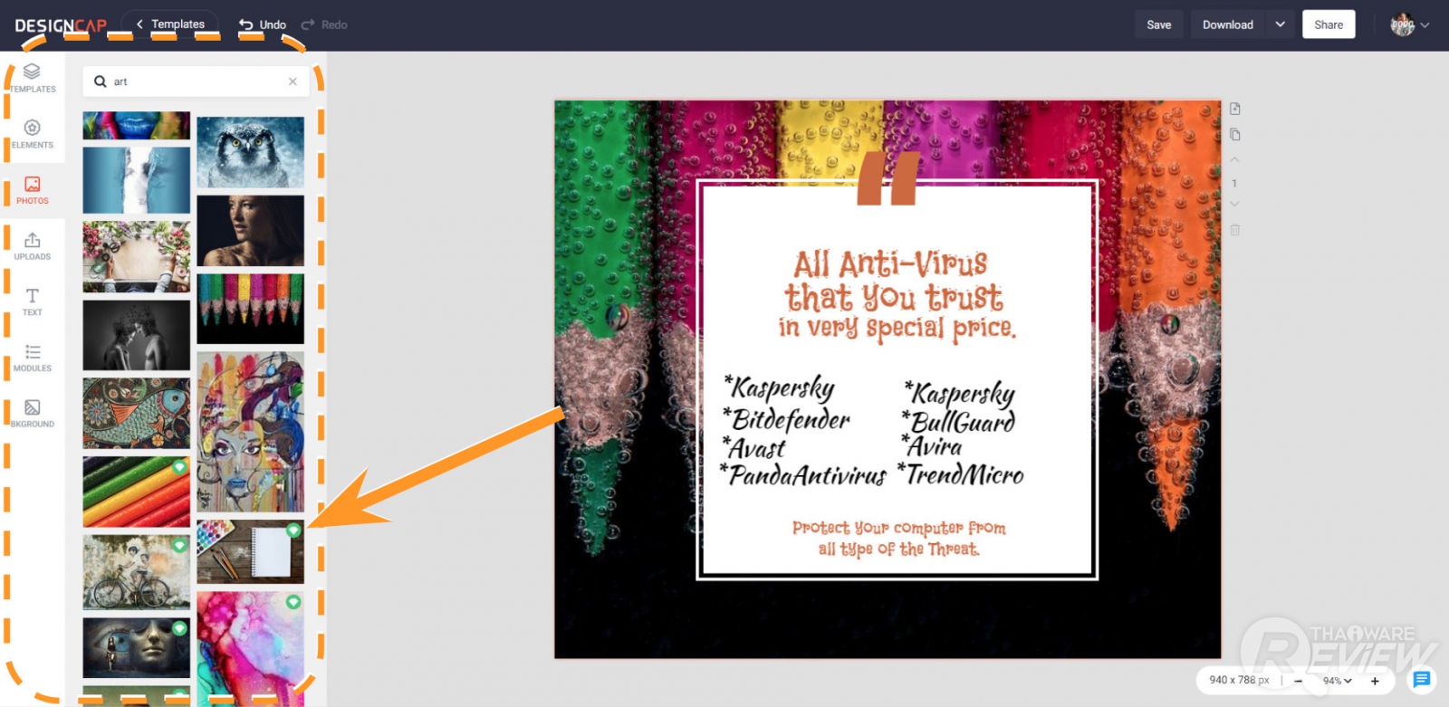 อีกหนึ่งในรายละเอียดงานออกแบบที่สร้างเอกลักษณ์ และความแตกต่างให้กับผลงานสร้างสรรค์ของเราได้อย่างมากมายคือ การเปลี่ยนภาพพื้นหลัง (โดยการเลือกเปลี่ยนภาพผ่านการคลิกเลือกแถบคำสั่ง Photos ตามภาพด้านบน) และแน่นอนว่า DesignCap เขามีภาพพื้นหลังสวยๆ ให้เราเลือกใช้ฟรีได้จำนวนหนึ่ง และภาพสวยๆ อีกส่วนหนึ่งเราต้องต้องเสียเงินลงทะเบียนใช้งาน (ภาพที่มีไอคอนรูปเพชรสีเขียวตรงมุมขวาตามที่ศรชี้)