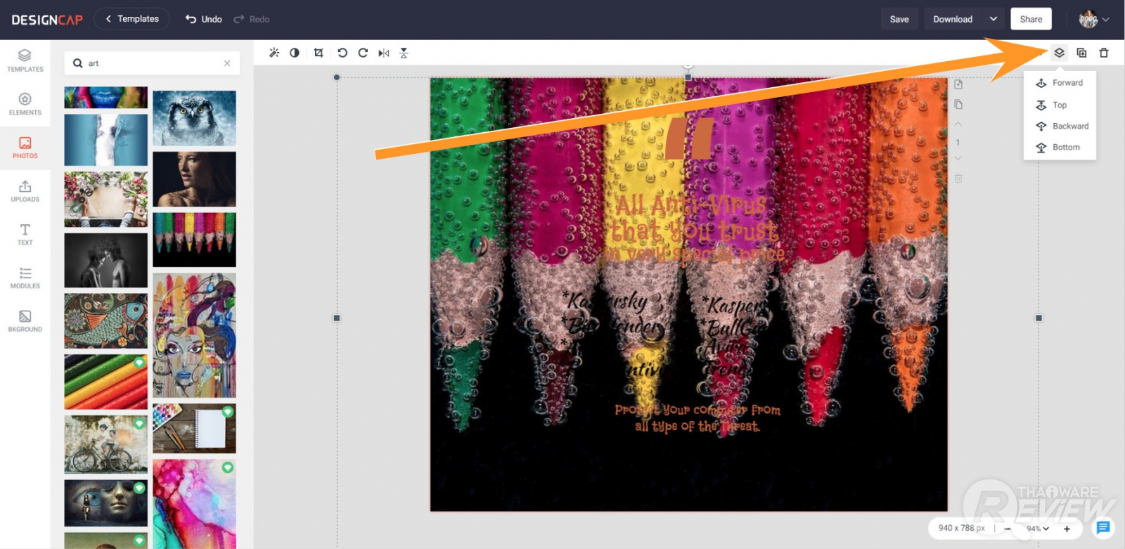 โดยการใส่ภาพพื้นหลัง เมื่อเราเลือกภาพได้แล้ว ภาพนั้นจะวางทับอยู่บนตัวอักษร ไม่ต้องตกใจว่าตัวอักษรทั้งหมดหายไปไหน สิ่งที่เราต้องทำเป็นอันดับแรกคือ ปรับย่อขยายขนาดภาพให้สวยงามพอดีเต็มพื้นที่ของงานออกแบบ จากนั้นให้คลิกที่ปุ่มคำสั่ง Layer ที่อยู่ตรงมุมขวาของหน้าจอ (ตามลูกศรชี้) จากนั้นคลิกที่คำสั่ง Backward เพื่อค่อยๆ ส่งภาพที่เราเพิ่งวางแปะลงไป ให้มันอยู่เป็นพื้นหลังของข้อความในภาพ ซึ่งเราต้องกดปุ่ม Backward ติดๆ กันหลายครั้งเลย กว่าที่ภาพจะถูกส่งไปเป็นพื้นหลังตามที่เราต้องการ
