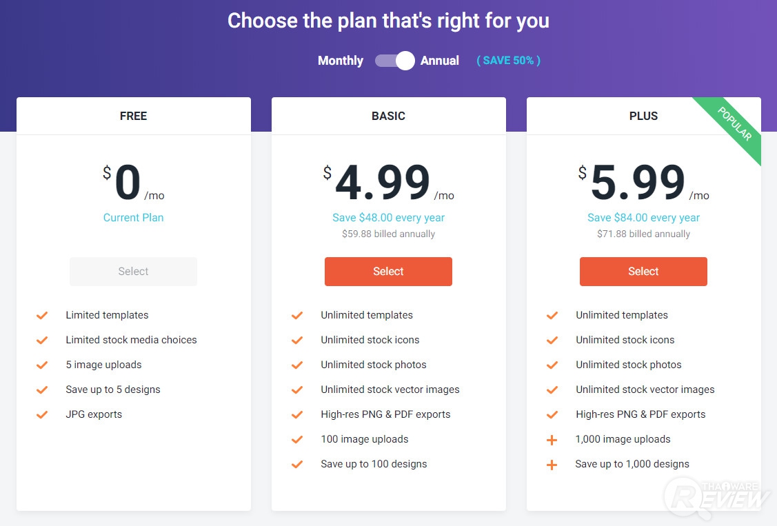 ถ้าต้องการฟีเจอร์ที่มากขึ้น ใช้งานได้อย่างไร้ข้อจำกัด DesignCap เขาก็มีแผนการจ่ายเงินแบบรายเดือนที่ดูแล้วก็น่าจะคุ้มค่าสำหรับคนที่ต้องออกแบบงานบ่อยๆ หรือต้องการนำภาพไปใช้ในลักษณะมืออาชีพอย่างจริงจัง โดยมีรายละเอียดดังนี้