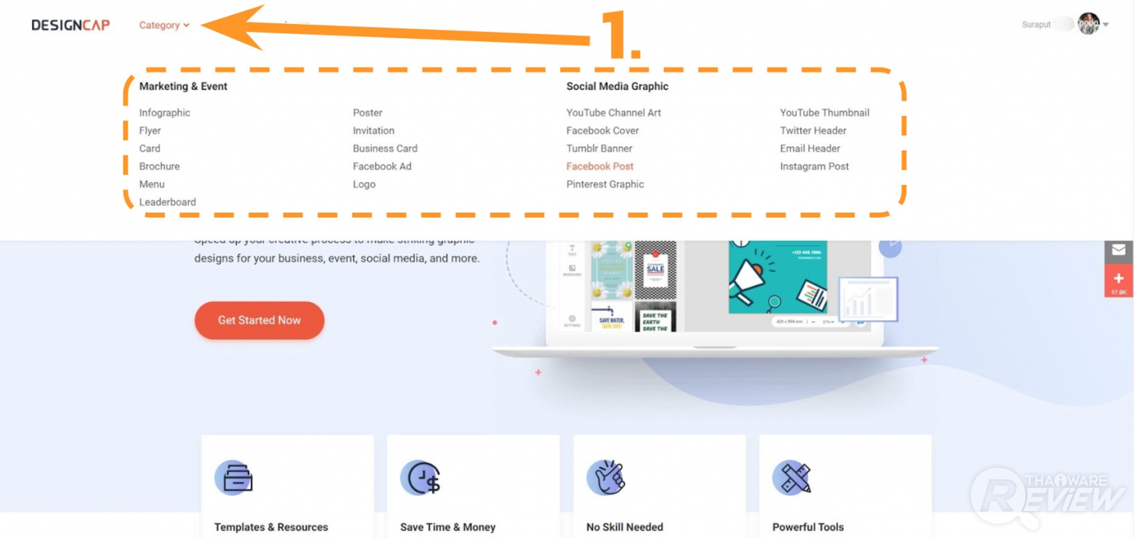ในหน้าหลักของเว็บ designcap.com ให้คลิกเลือกที่คำสั่ง Catagory (หมายเลข 1.) ก็จะมีแถบรายชื่อของประเภทงานออกแบบที่เว็บไซต์นี้รองรับ เพื่อให้เราเลือกสร้างสรรค์งานออกแบบได้ตามต้องการเลย โดยที่มีการแบ่งประเภทงานออกแบบ เป็น 2 ประเภทใหญ่ๆ คือ Marketing & Event (การออกแบบสิ่งพิมพ์ และสื่อทางการตลาด) และ Social Media Graphic (ภาพสำหรับโพสต์ลงสื่อโซเชียล และสื่อออนไลน์) โดยที่มีประเภทของงานออกแบบให้เลือกได้ ดังนี้