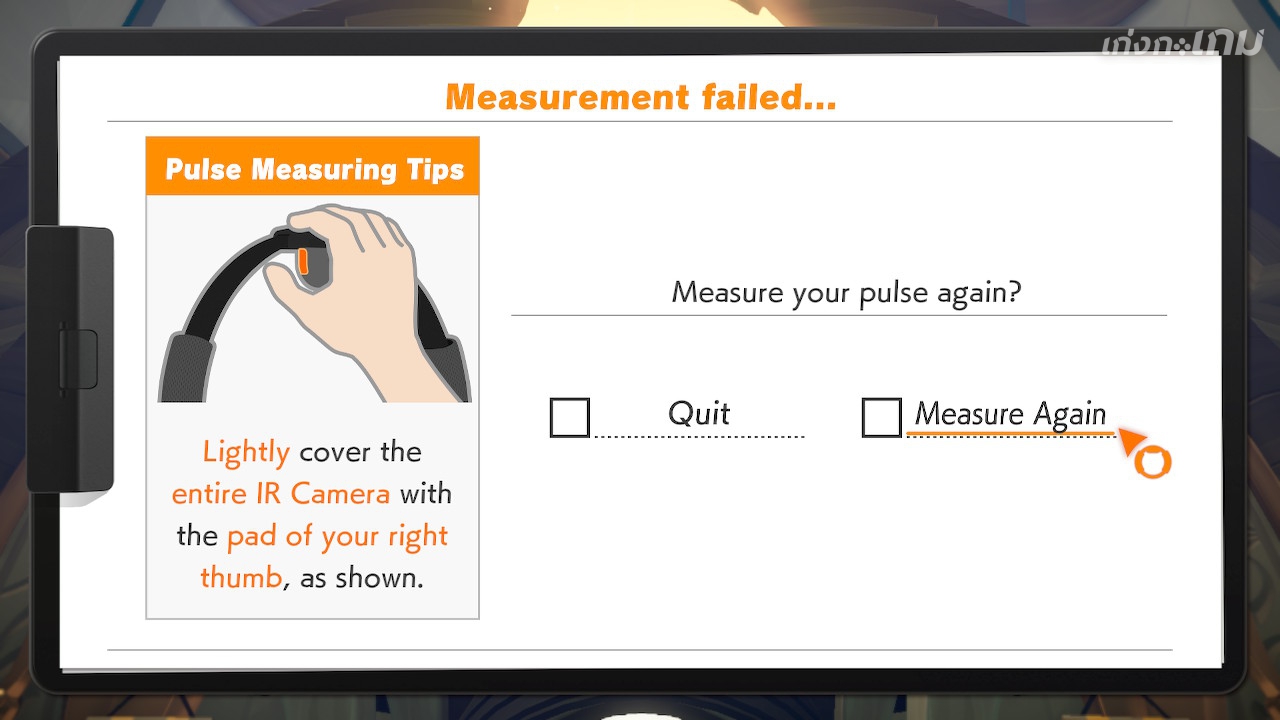 ซึ่งการวัดชีพจรนี้จะมีให้วัดกันหลังเล่นจบในแต่ละด่าน วิธีการคือวางนิ้วโป้งขวากดเบาๆ ที่แถบสีดำใต้ Joy-Con แล้วค้างไว้สักพัก (จะลองนิ้วอื่นก็ได้แต่ไม่แม่นยำเท่าไหร่) ระวังอย่ากดหนักเกินไปเพราะจะไม่สามารถวัดได้