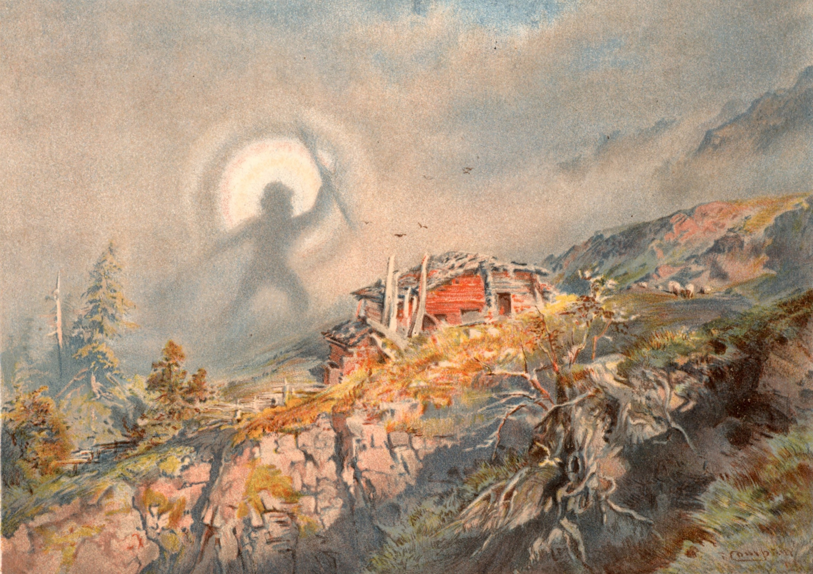 รูปวาดของปรากฏการณ์ Brocken Spectre ในปี 1754 ที่ ณ ขณะนั้นยังเข้าใจว่าเป็นอสูรกายประจำเทือกเขาอยู่