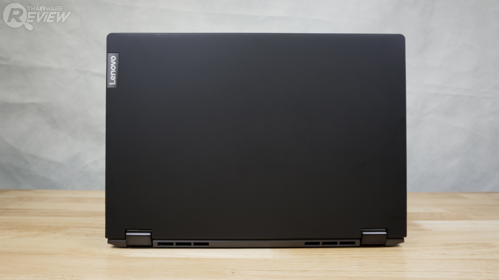 ด้านหลังเครื่องมีบานพับจอแบบคู่ที่วัสดุทำจากโลหะ ดูแข็งแรงทนทานรองรับการพับได้ถึง 360 องศา ส่วนด้านข้างมีช่องระบายความร้อนคู่ที่อยู่ข้างๆ กัน เวลาใช้งานลมเย็นจะถูกดูดขึ้นจากใต้เครื่องแล้วเป่าออกมาเป็นลมร้อนที่หลังเครื่อง ไม่รบกวนการใช้งาน