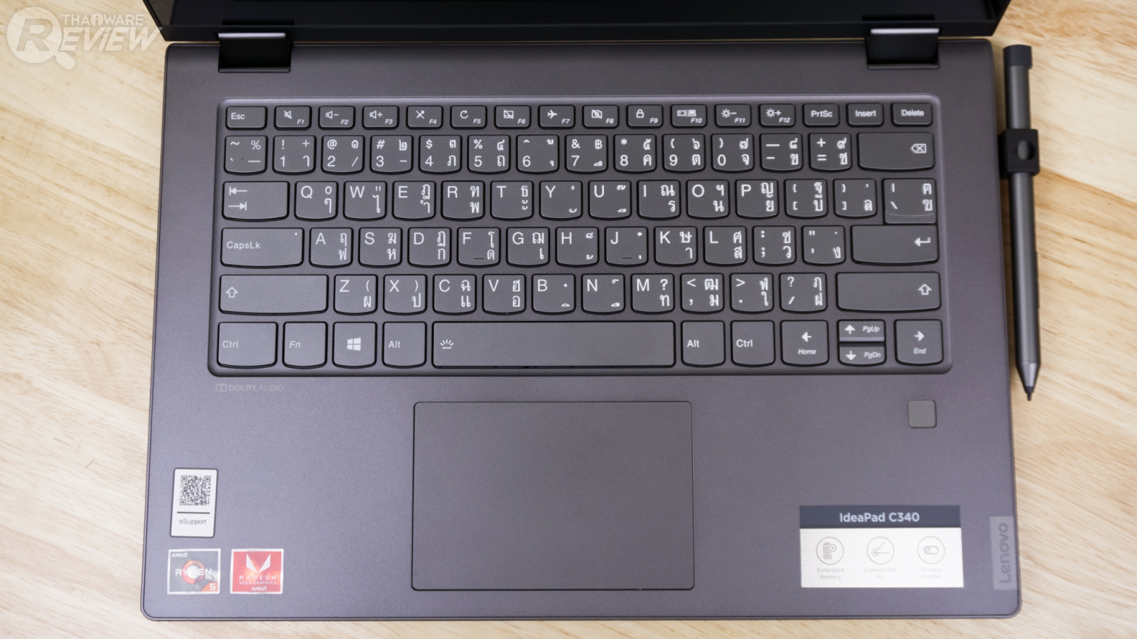 ถัดลงมาอีกหน่อยก็เป็นโลโก้ DOLBY AUDIO, ทัชแพด และเซ็นเซอร์สแกนลายนิ้วมือสำหรับปลดล็อกเครื่อง (ใช้กับ Windows Hello) สุดท้ายมีมีโลโก้ AMD Ryzen 5/Radeon Vega/QR-Code (สำหรับ Support) และชื่อรุ่น IdeaPad C340 พร้อมโลโก้ Lenovo ด้านขวาล่าง