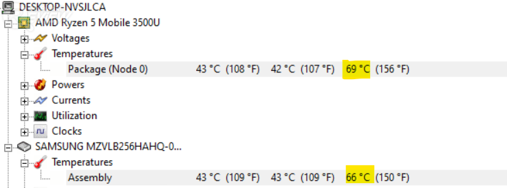 เหตุผลที่เกิดความร้อนขนาดนี้คือ SSD ที่เป็น M.2 นั้นสร้างความร้อนสูงมากขณะอ่านเขียนข้อมูล โดยความร้อนเริ่มที่ 43 องศา และพาไปถึง 66 องศาเลยทีเดียว แถมในส่วนนั้นยังไม่มีช่องระบายอากาศอีกด้วย (รูระบายอากาศอยู่ด้านบน) เลยทำให้เกิดความร้อนสะสมอยู่ในจุดเดียว พอเยอะเข้าก็ลามขึ้นมาถึงที่วางมือฝั่งซ้าย ทำให้เวลาพิมพ์งานรู้สึกไม่สบายข้อมือสักเท่าไร