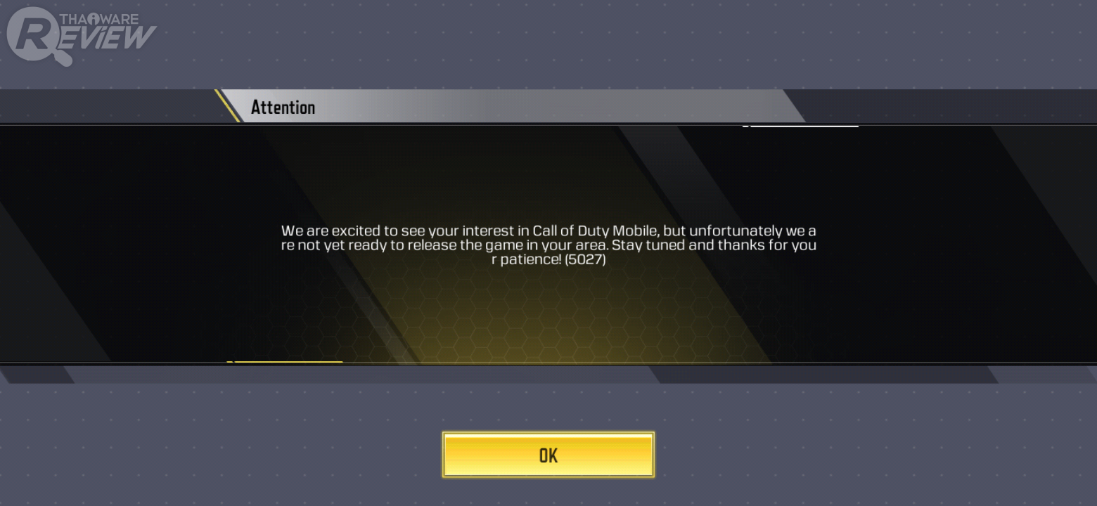 อีกอันคือ Call of Duty Mobile (จัดซะเกมใหญ่เลย) ที่ไม่สามารถเข้าเกมได้ อาจเป็นเพราะตัวเครื่องไม่รองรับ แต่ข้อความที่ฟ้องออกมา กลายเป็นว่าเกมไม่รองรับในพื้นที่ๆ เราอยู่ (จะเป็นไปได้ไงนะ?)