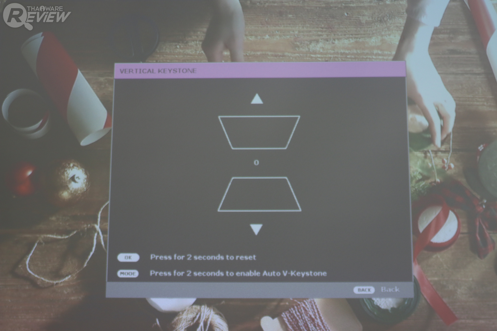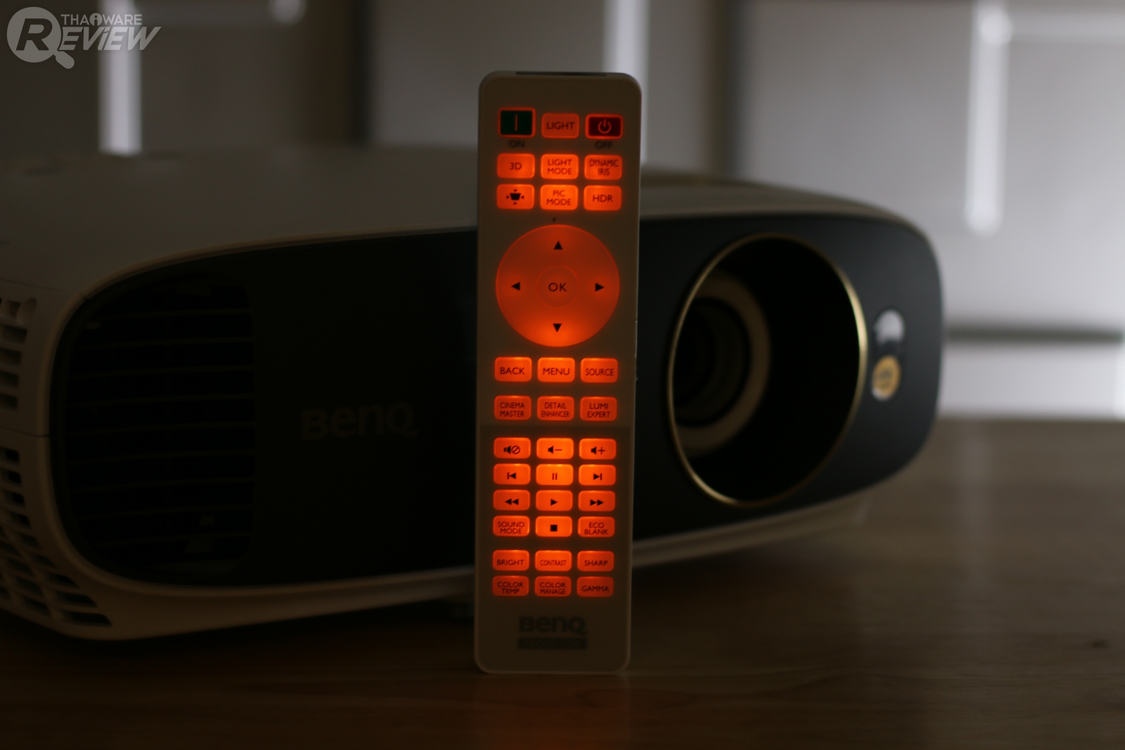 ตัวรีโมทก็มีปุ่มเมนูสำหรับการใช้งานครบถ้วน และแน่นอนว่าการใช้งานโปรเจคเตอร์ส่วนใหญ่จะอยู่ในห้องมืด ตัวรีโมทจึงมีแสงไฟสำหรับการใช้งานในห้องที่ไม่มีแสงสว่างได้
