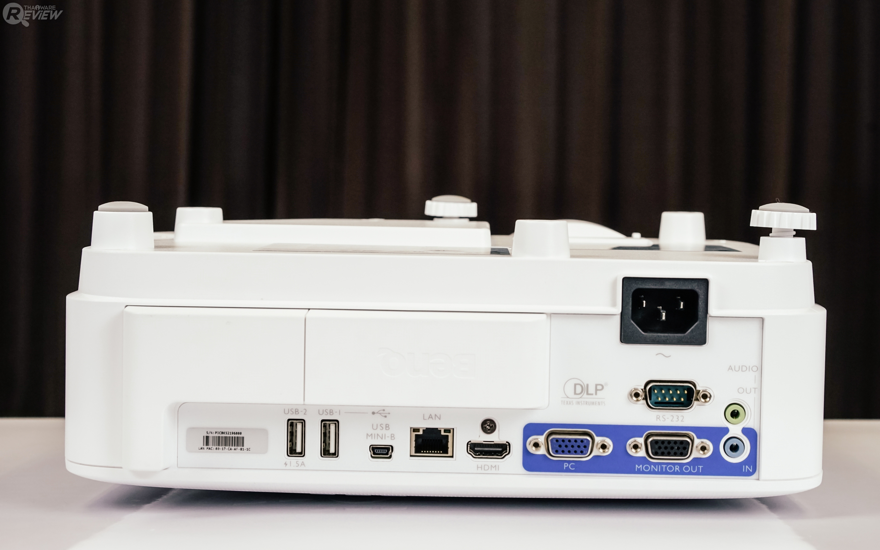 ด้านหลังเป็นที่อยู่ของพอร์ตเชื่อมต่อต่างๆ ซึ่ง โปรเจคเตอร์ BenQ EW800ST ก็ให้พอร์ตต่างๆ มาค่อนข้างครบนะ ทั้ง VGA/ HDMI/ USB/ LAN และช่องต่อเสียงอย่าง Audio IN/OUT มั่นใจได้เลยว่าจะรองรับอุปกรณ์ต่างๆ ได้อย่างครบถ้วน