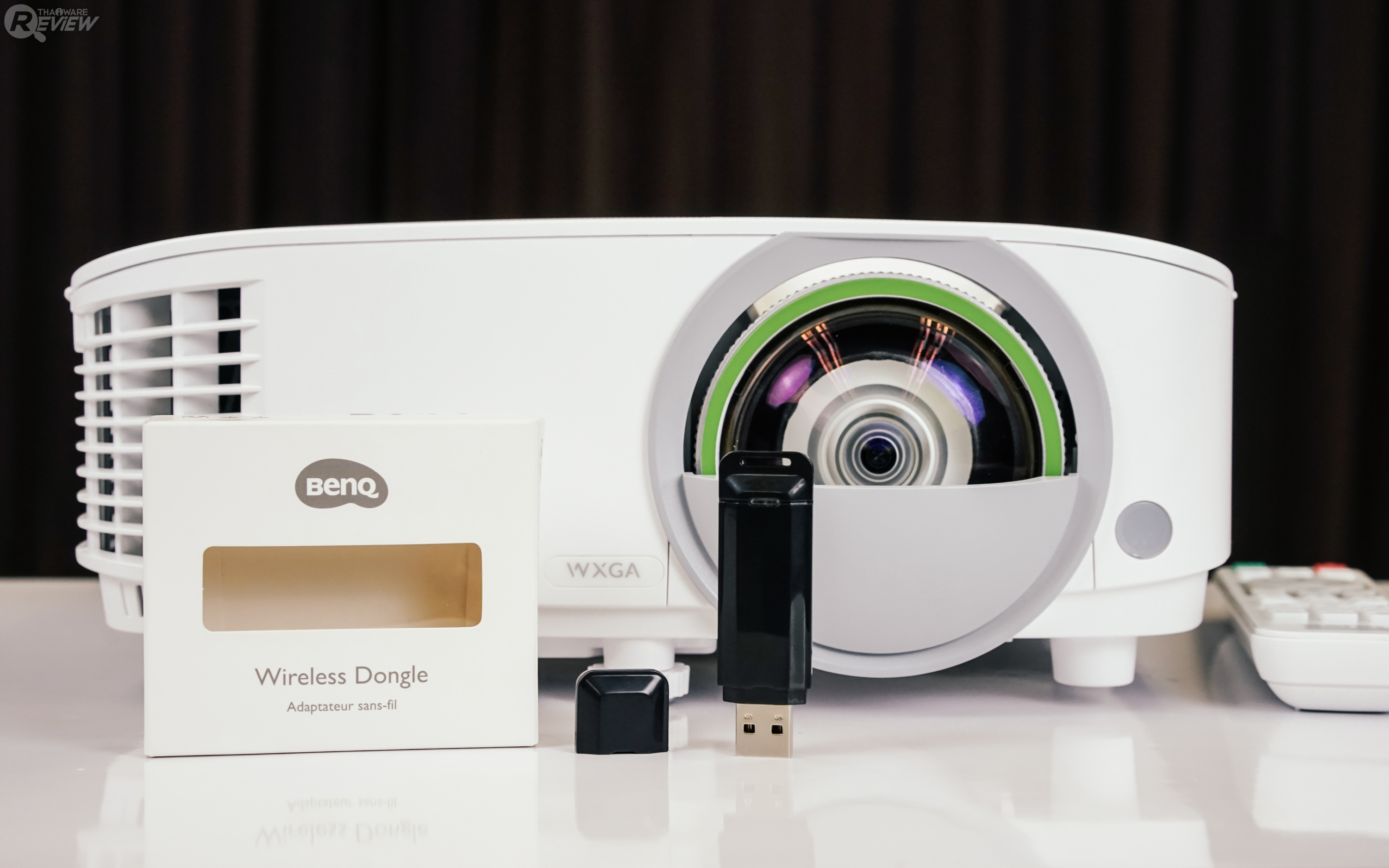 โปรเจคเตอร์ BenQ EW800ST ยังรองรับการเชื่อมต่อ Wi-Fi ได้ด้วย โดยเราจะต้องเสียบ Wi-Fi Dongle ผ่านช่อง USB ซึ่งมีแถมมาให้พร้อมกับโปรเจคเตอร์ รองรับการปล่อยคลื่นสัญญาณทั้ง 2.4G และ 5G โดย BenQ ได้ออกแบบช่องเสียบลับมาให้ซ่อน Wi-Fi Dongle เอาไว้อย่างแนบเนียน