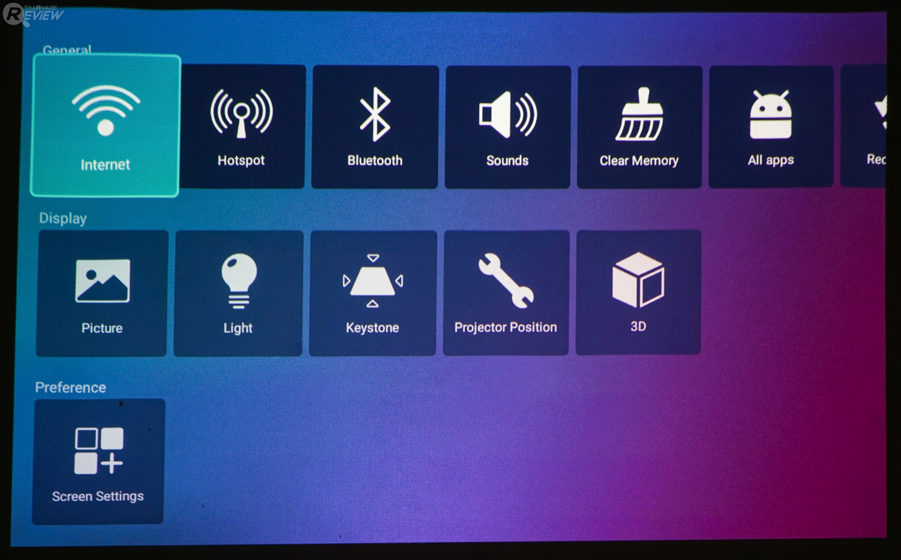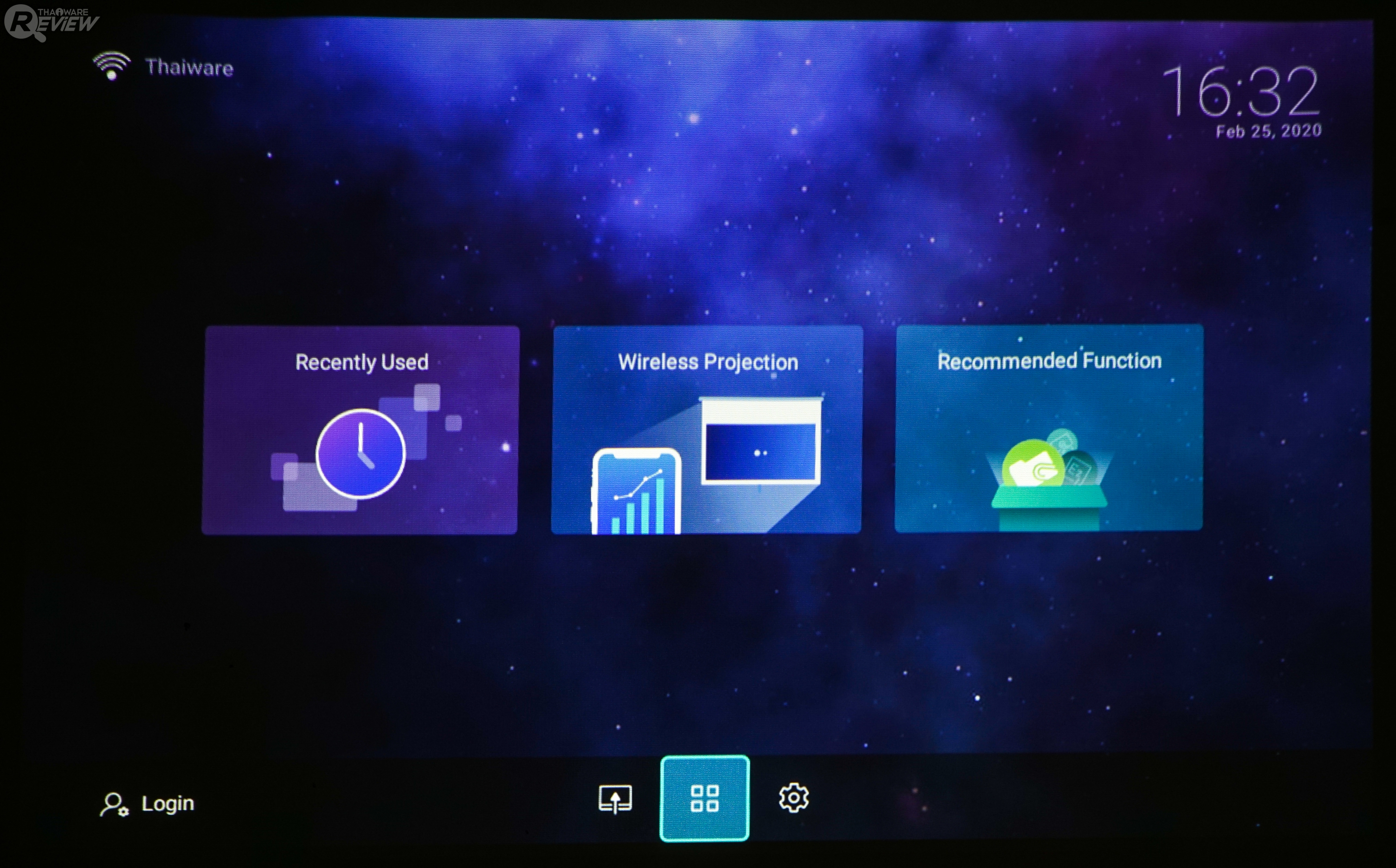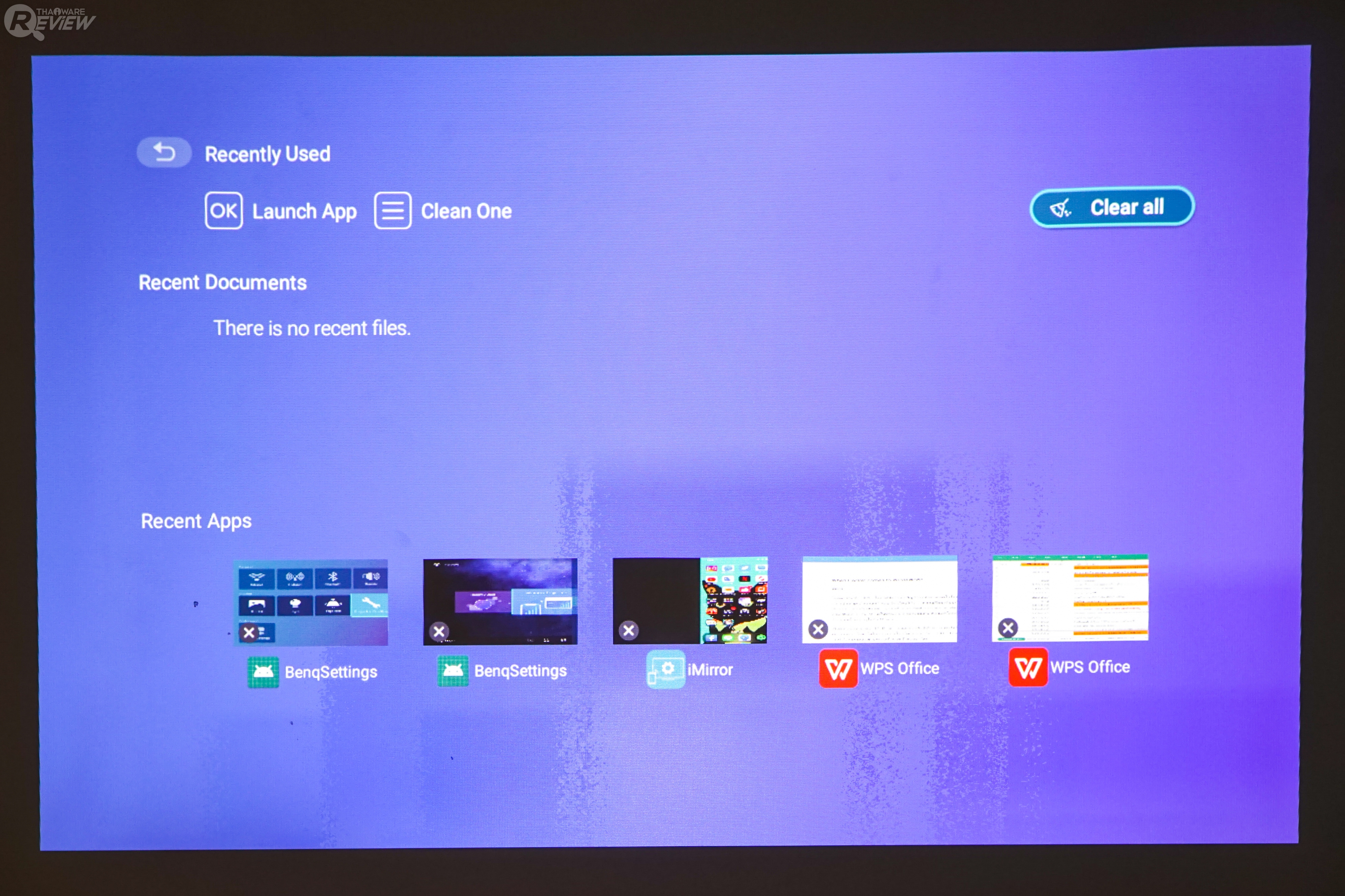 เมื่อเราเปิดโปรเจคเตอร์ BenQ EW800ST ขึ้นมา ก็จะพบกับหน้าจอที่คล้ายกับหน้าจอของแท็บเล็ต Android แต่ตัว User Interface มีการปรับแต่งให้เหมาะสมกับการควบคุมด้วยรีโมทคอนโทรล
