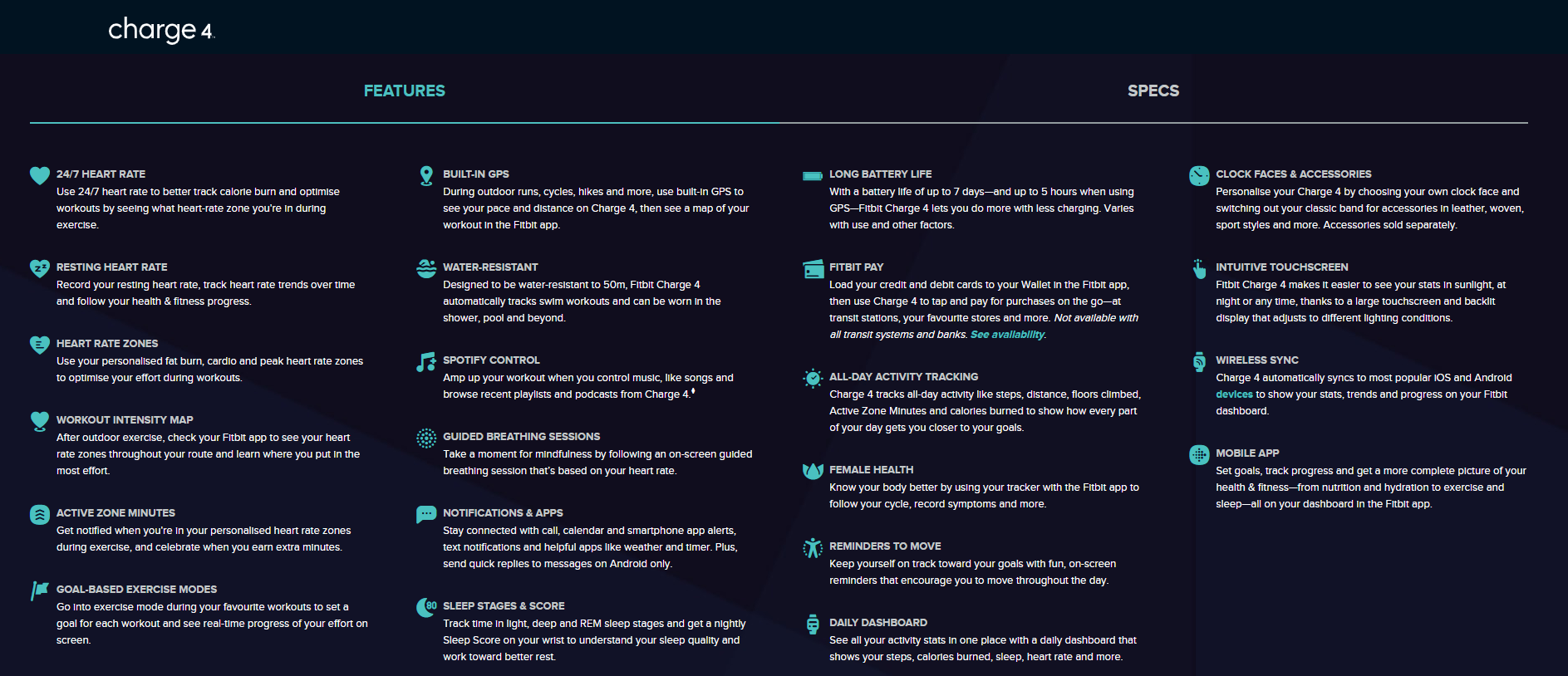 สำหรับอุปกรณ์ที่จำหน่ายในปี 2020 นี้ หน้าจอขาวดำ 1 นิ้ว ของ Fitbit Charge 4 ออกจะไม่น่าจะประทับใจเท่าไหร่นัก (จอนี้ใช้มาตั้งแต่ Fitbit Charge 3 ที่วางจำหน่ายในปี 2018) แม้จอชนิดนี้จะมีจุดเด่นด้านประหยัดแบตเตอรี่ แต่ในท้องตลาดตอนนี้ก็มีอุปกรณ์ประเภทเดียวกันที่เป็นจอสี โดยที่แบตเตอรี่ก็ใช้งานได้หลายวันเหมือนกัน