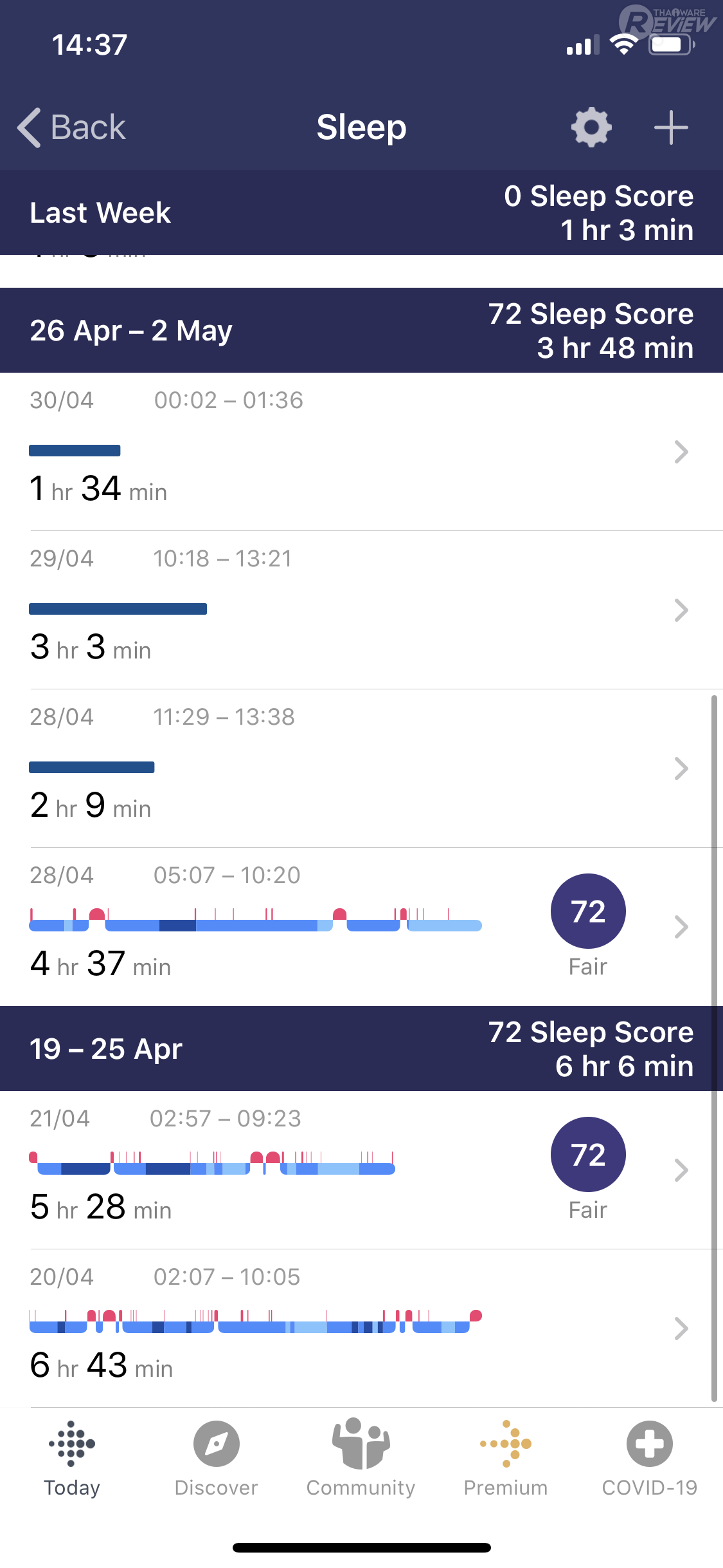 ภาพด้านล่างนี้เป็นตัวอย่างข้อมูลการนอนหลับของตัวผมเอง เห็นแล้วก็ตกใจเหมือนกัน รู้สึกเลยว่าพักผ่อนน้อยเกินไป ข้อมูลนี้เราสามารถดูบันทึกย้อนหลังได้เป็นเดือนๆ เลยล่ะ เก็บละเอียดมาก