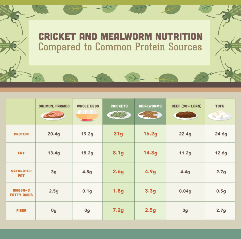 แมลงตัวเล็กๆ เหล่านี้อุดมไปด้วย แร่ธาตุและสารอาหารที่จำเป็นกับร่างกายมนุษย์ อยู่เป็นจำนวนมาก ซึ่งภายในตัวของแมลงแต่ละชนิดก็มีจำนวนสารอาหารที่แตกต่างกันออกไป แต่เมื่อนำเอาไปเปรียบเทียบกับเนื้อสัตว์และโปรตีนชนิดอื่นๆ อย่างเนื้อไก่, เนื้อหมู, เนื้อวัว, เนื้อปลา, ไข่ หรือแม้กระทั่งเต้าหู้ในปริมาณที่เท่ากันแล้วนั้น เฉลี่ยแล้วแมลงมีจำนวนสารอาหารโดยรวมที่มากกว่าเนื้อสัตว์ประเภทอื่นๆ อยู่มากเลยทีเดียว อีกทั้งยังมีปริมาณไขมันที่น้อยกว่าอย่างเห็นได้ชัด ทำให้บุคคลที่ รักสุขภาพ บางคนหันมารับประทานอาหารหรือขนมที่มีส่วนผสมของแมลงกันเพิ่มมากขึ้น
