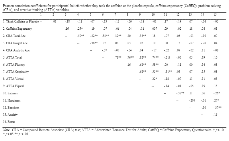 ซึ่งผลออกมาว่ากลุ่มที่ได้รับคาเฟอีน (กลุ่มที่ดื่มกาแฟ) มีกระบวนการคิดแก้ปัญหาแบบ Convergent ที่ดีขึ้นจากเดิมอย่างมีนัยสำคัญทางสถิติ แต่ในด้านของความคิดแบบ Divergent ไม่ได้มีการเปลี่ยนแปลงอย่างเห็นได้ชัด และสารคาเฟอีนเองก็ไม่ได้มีผลต่อความจำระยะสั้นด้วยเช่นกัน ส่วนด้านอารมณ์ กลุ่มตัวอย่างบางคนก็รายงานว่ารู้สึกอารมณ์ดีขึ้นหลังดื่มกาแฟ