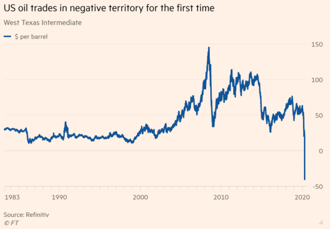 โดยปกติแล้วสัญญาซื้อขายน้ำมันล่วงหน้าจะตัดรอบทุกๆ สิ้นเดือน แต่ในช่วงปี 2020 นี้จะเห็นว่าราคาน้ำมันตกติดต่อกันมาเป็นเวลาหลายเดือนและไม่มีท่าทีว่าจะดีขึ้น แถมจำนวนน้ำมันคงคลังก็ไม่ลดน้อยไปเท่าไรนัก จึงทำให้บริษัทน้ำมันต่างๆ ตัดสินใจเทขายสัญญาก่อนหมดอายุลง และไม่ขยายการต่ออายุสัญญาเพราะเกรงว่าราคาน้ำมันจะตกลงไปมากกว่านี้ จนทำให้วันที่ปิดตลาดการซื้อขายสัญญา (20 เมษายน 2020) ราคาน้ำมันดิบ WTI ดิ่งลงสูงสุดถึง 300% โดยจากเดิมที่ราคาราว 17.85 ดอลลาร์ต่อบาร์เรล ร่วงลงไปอยู่ที่ -37.63 ดอลลาห์ต่อบาร์เรลภายในเวลาเพียงไม่กี่ชั่วโมงเท่านั้น ซึ่งก็นับว่าเป็นครั้งแรกในประวัติศาสตร์ที่ราคาน้ำมันตกลงจนถึงระดับนี้