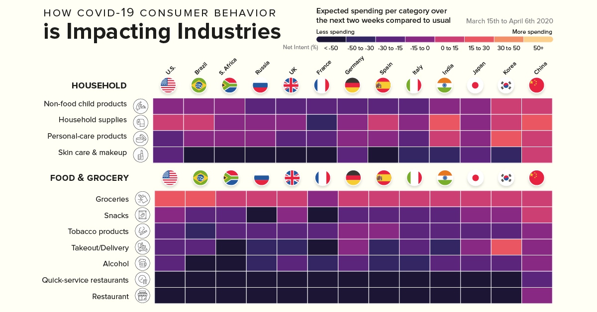 พฤติกรรมการซื้อสินค้าของผู้บริโภคทั่วโลกช่วงวันที่ 15 มีนาคม ถึงวันที่ 6 เมษายน 2020 จะเห็นได้ว่าผู้บริโภคมีความต้องการซื้อสินค้าลดลง