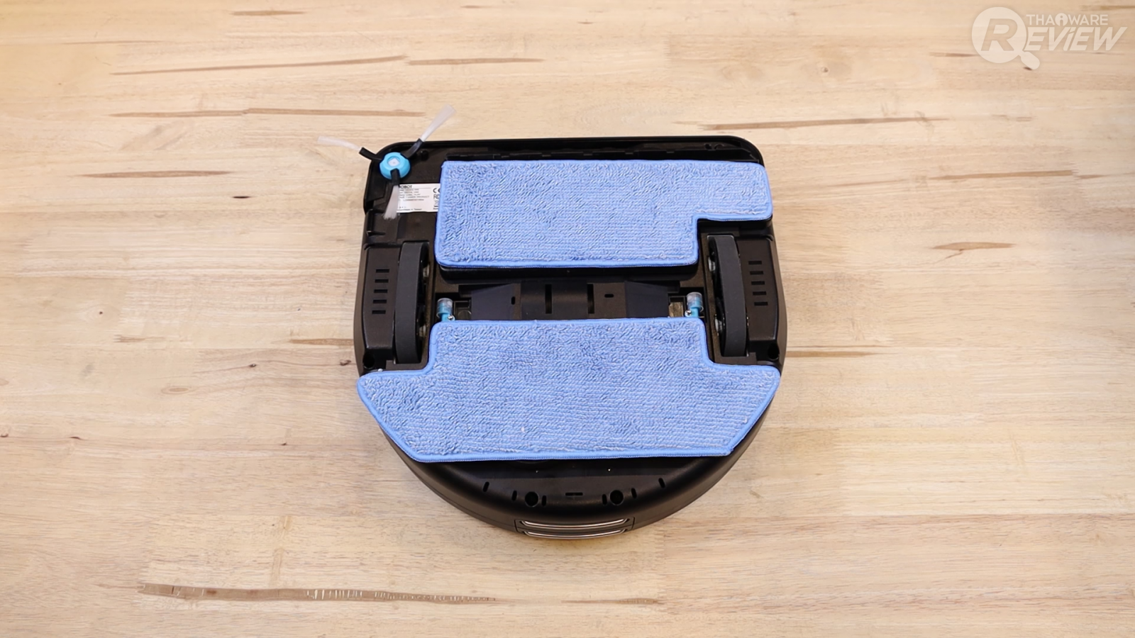 ส่วนด้านล่างของเครื่องนั้นประกอบไปด้วย แผ่นผ้าเช็ดทำความสะอาดจำนวน 2 แผ่น, แปรงปัดทำความสะอาด, สายพานที่เปรียบเสมือนล้อของตัวเครื่อง ซึ่งสายพานอันนี้นี่เองที่เป็นเคล็ดลับของการไม่ทิ้งรอยในการทำความสะอาดของหุ่นยนต์, หัวฉีดสเปรย์ซ้ายขวา, และเลเซอร์ 2 จุดซ้ายขวาบริเวณได้ตัวกันกระแทกเพื่อเอาไว้ตรวจจับทางต่างระดับ เช่น บันได