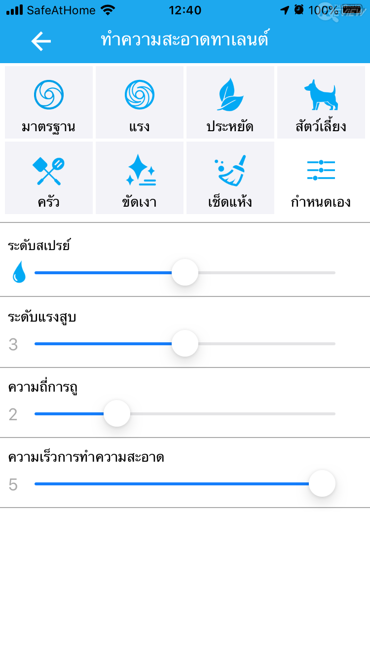 ซึ่งในแต่ละโหมด เราสามารถเข้าไปปรับตั้งค่าได้ตามความเหมาะสมในการใช้งาน ตั้งแต่ปรับระดับน้ำ, ปรับระดับความแรงในการดูดฝุ่น, ปรับความเร็วในการทำความสะอาด หรือแม้กระทั่งการปรับรอบความถี่ในการถู ให้เหมาะกับพื้นที่ที่เราสามารถประเมินความหนักเบาของความสกปรกได้เองอีกด้วย