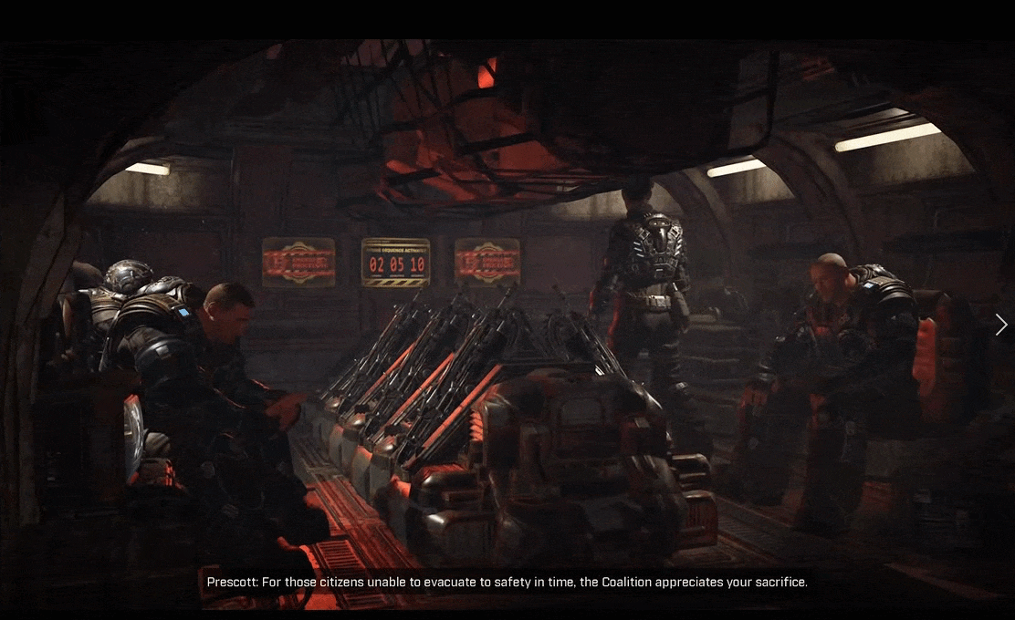 โดยในคัทซีนแรก เปิดมาเราจะได้เห็น Gabriel และหน่วยทหารของเขากำลังจิตตกกับคำแถลงการณ์ที่ประกาศโดยรัฐบาลกลาง ซึ่งไม่ใช่ข่าวดีซักเท่าไหร่ ทำให้ตอนนี้ผู้เล่นเริ่มทราบสถานการณ์ของตัวละครเป็นอย่างดีแล้วว่า ไม่สามารถพึ่งพาใครได้อีกต่อไป นอกจากพึ่งพาตัวเอง เพราะทุกหนแห่งบนดาวแห่งนี้เริ่มกลายเป็นทะเลเพลิง จากฝีมือของพวก Locust ซึ่งมีเหล่าทหาร Gears ที่เหลือรอดทุกชีวิต เป็นความหวังสุดท้ายของมนุษยชาติ