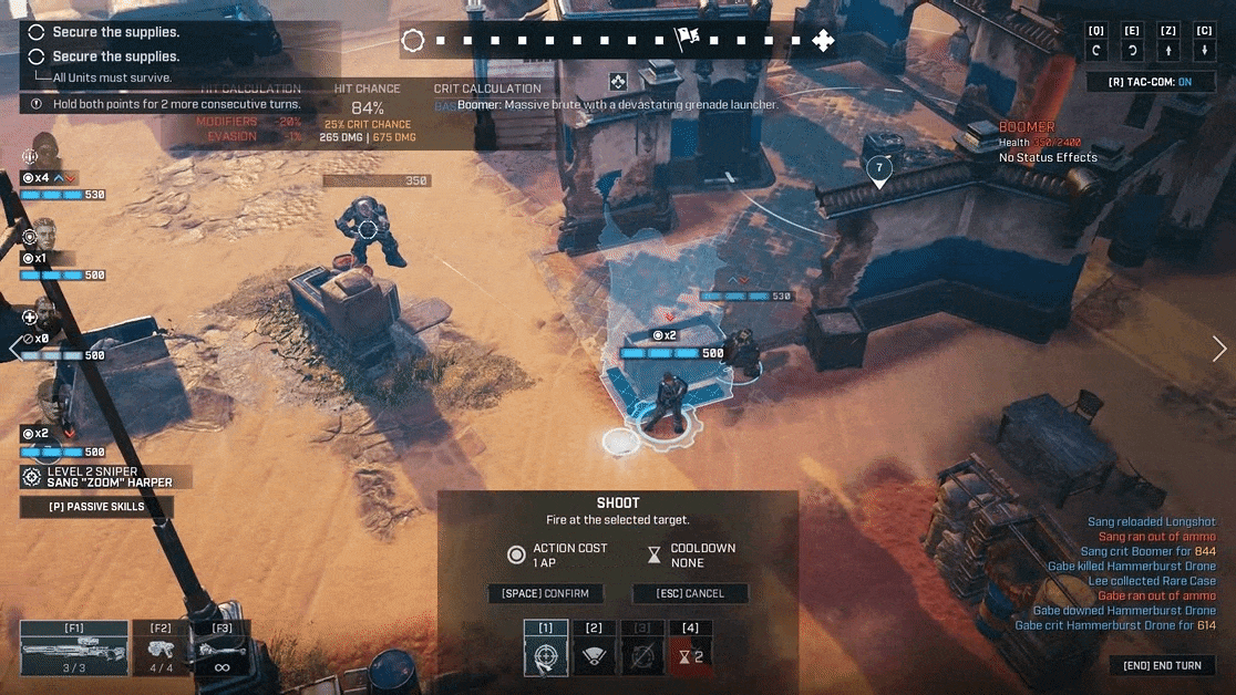 โดยอาวุธหลักๆ แต่ละตัวจะมีทั้งปืนสั้น ปืนยาว และระเบิดติดตัว ซึ่งการกระทำทุกอย่าง หรือแม้แต่การเดินทหารของเราจะเสียแอคชันที่จำกัดไว้ให้ในเทิร์น ซึ่งแต่ละคนจะมีให้แค่ 3 แอคชัน ดังนั้นการจะทำอะไร ควรต้องคิดให้ดีก่อนเสมอ เพราะถ้าผิดพลาดขึ้นมา จากได้เปรียบ เราอาจเสียเปรียบทันที