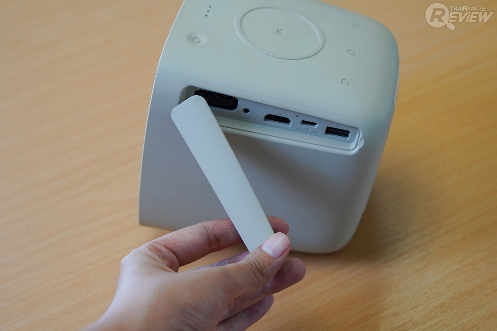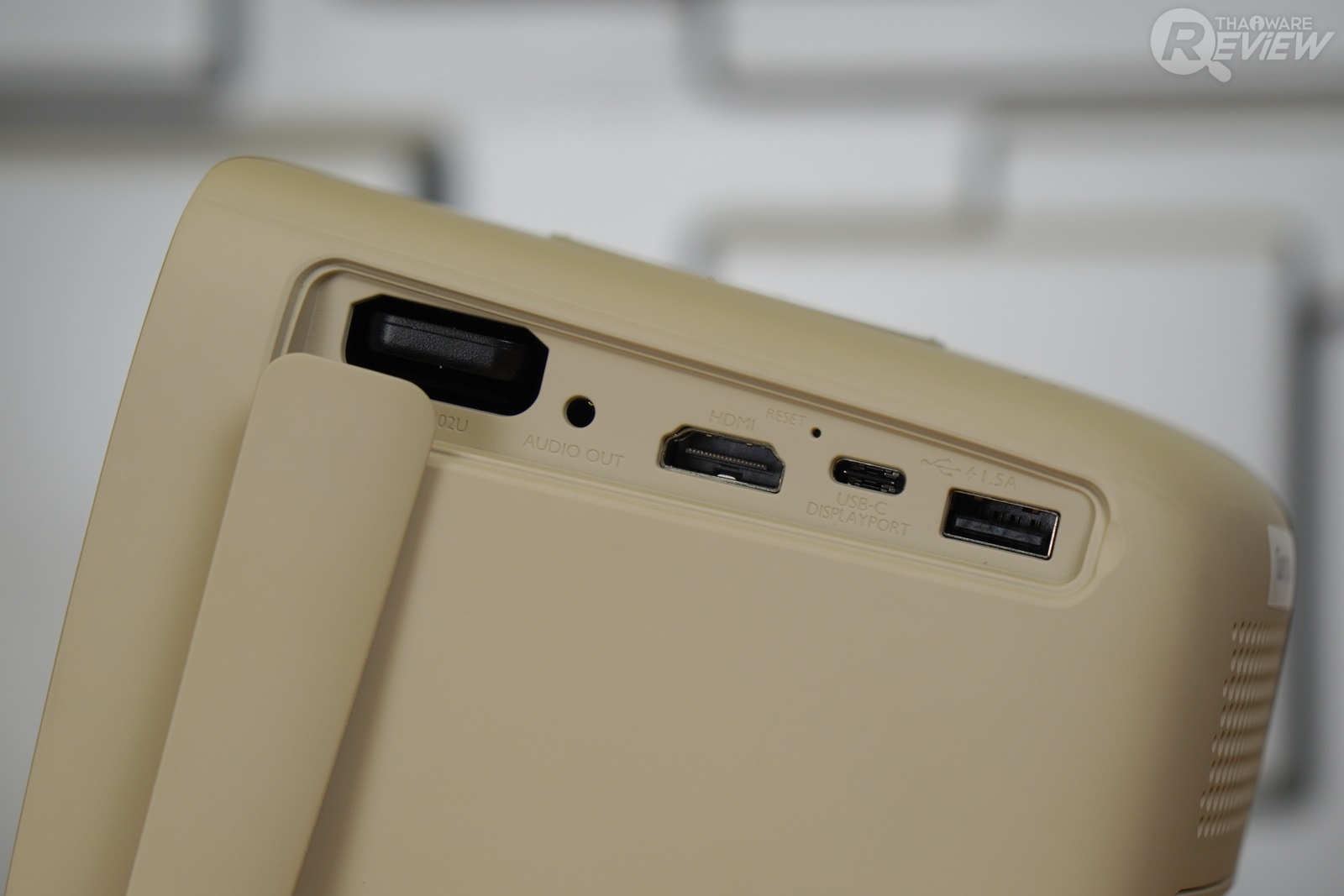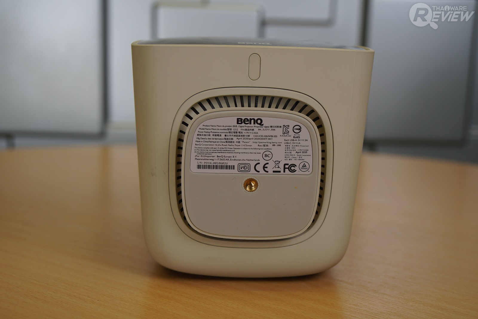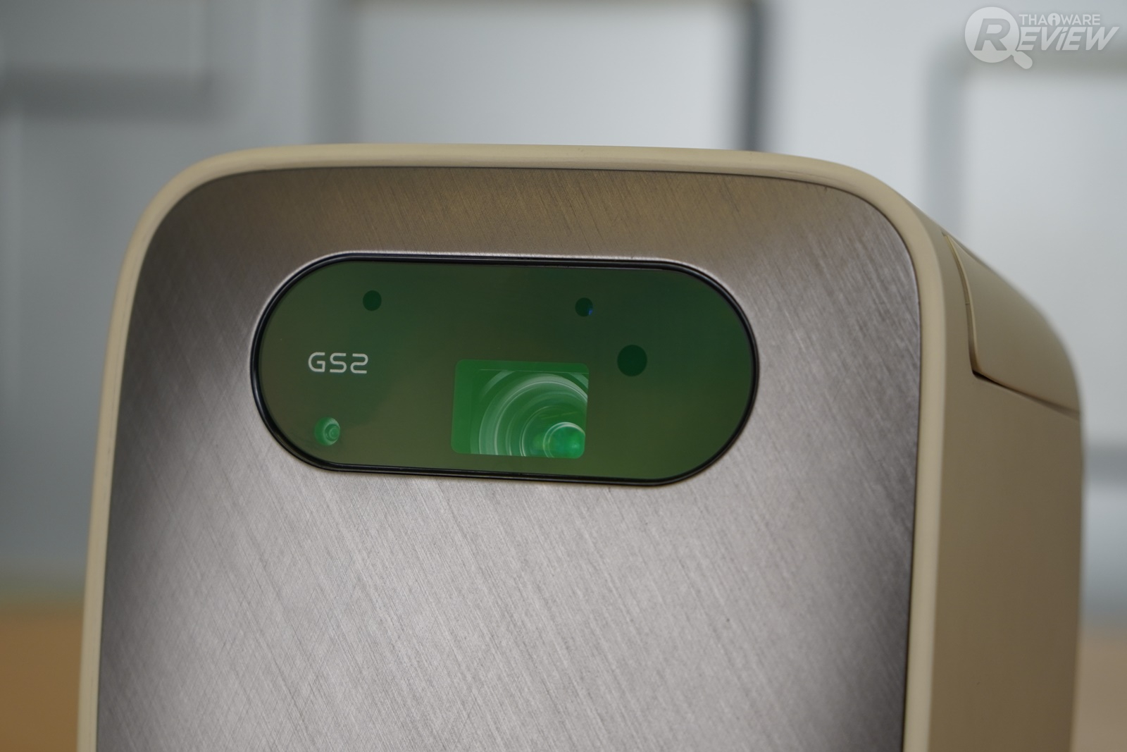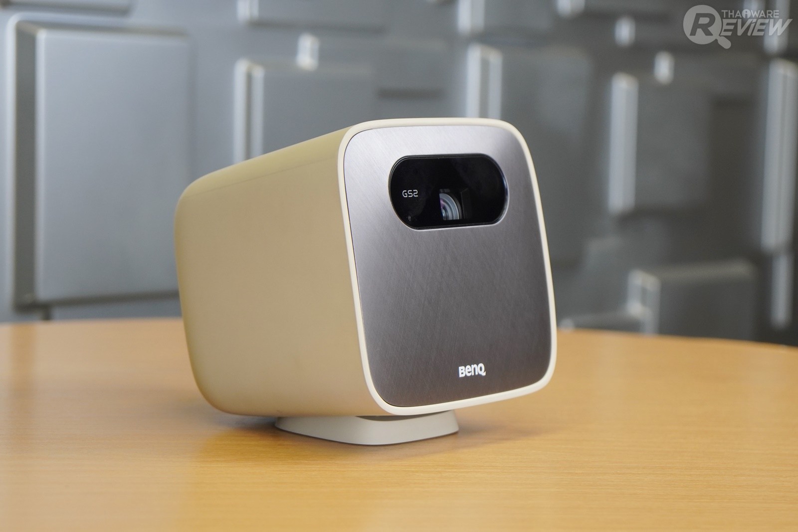 BenQ GS2 มีความแตกต่างจากโปรเจคเตอร์ที่ใช้ในสำนักงานพอสมควร ด้วยขนาดเล็ก รูปทรงสี่เหลี่ยมลูกบาศก์สีน้ำตาลอ่อน ออกแบบดีไซน์ให้ดูน่ารัก มีปุ่มเปิด-ปิดตัวเครื่องและปุ่มควบคุมต่างๆ อยู่ที่ด้านบนของเครื่อง ด้านหลังเป็นตำแหน่งของลำโพง ช่องระบายความร้อน และช่องเสียบสายชาร์จ ส่วนด้านข้างของเครื่องมีช่องพอร์ตต่างๆ มีฝาปิดกันฝุ่น แต่เห็นดีไซน์น่ารักแบบนี้ โปรเจคเตอร์พกพาอย่าง BenQ GS2 ก็มีความแข็งแรง ทนทาน ด้วยคุณสมบัติรองรับแรงกระแทกในระยะความสูง 50 เซนติเมตร และกันละอองน้ำระดับ IPX2 สามารถใช้งานกลางแจ้งได้สบายๆ