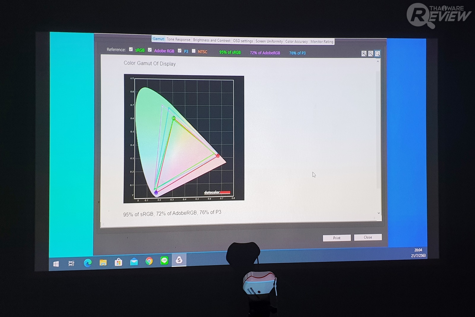 ส่วนเรื่องความแม่นยำของสี ทางไทยแวร์ได้ทำการทดสอบ BenQ GS2 ด้วยโปรแกรม SpyderXElite 5.6 จากค่าสีที่ได้ พบว่าโปรเจคเตอร์รุ่นนี้ก็ให้ค่าสีที่ค่อนข้างแม่นยำทีเดียว ด้วยค่า sRGB 95%, 72% of AdobeRGB, และ 76% of P3
