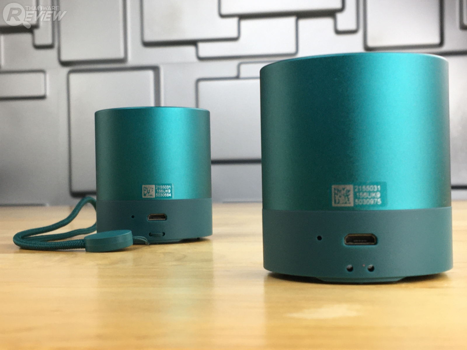 ด้านหลังของ ลำโพงขนาดเล็ก ลำโพงพกพา HUAWEI Mini Speaker จะมีช่องสำหรับเสียบ USB เพื่อชาร์จแบต ไมโครโฟน และรูสำหรับห้อยสายคล้องข้อมือ