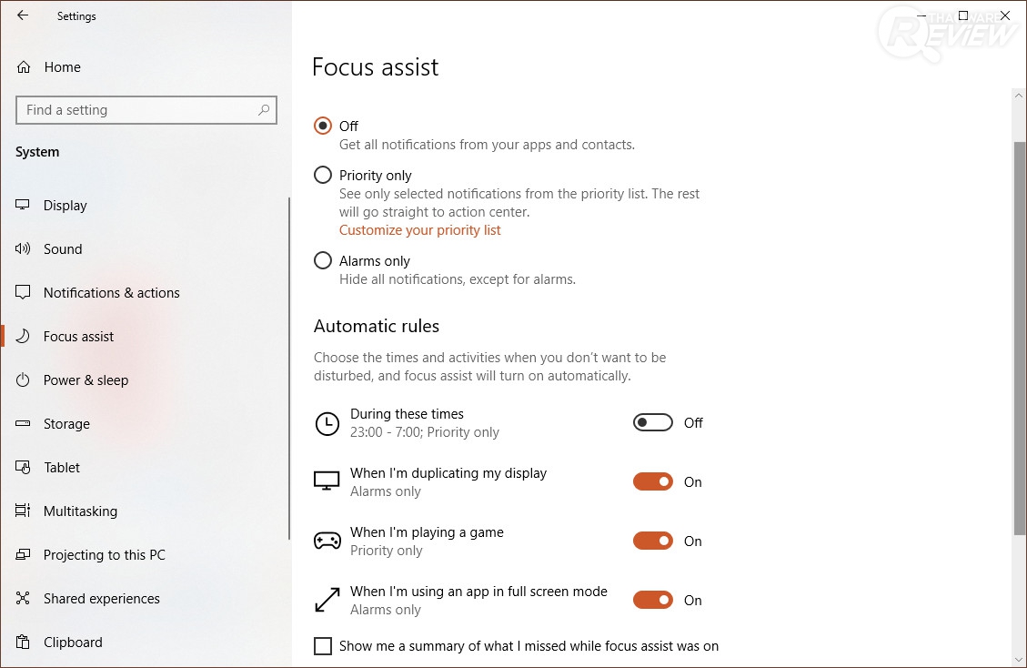 Focus Assist เป็นคุณสมบัติที่ช่วยให้เราทำงานอย่างมีสมาธิ ไม่ถูกการแจ้งเตือนรบกวน ด้วยการซ่อนหน้าต่างแจ้งเตือนทั้งหมดเอาไว้ เมื่อคุณกำลังทำงาน หรือเล่นเกมแบบเต็มหน้าจอ (Full-screen)
