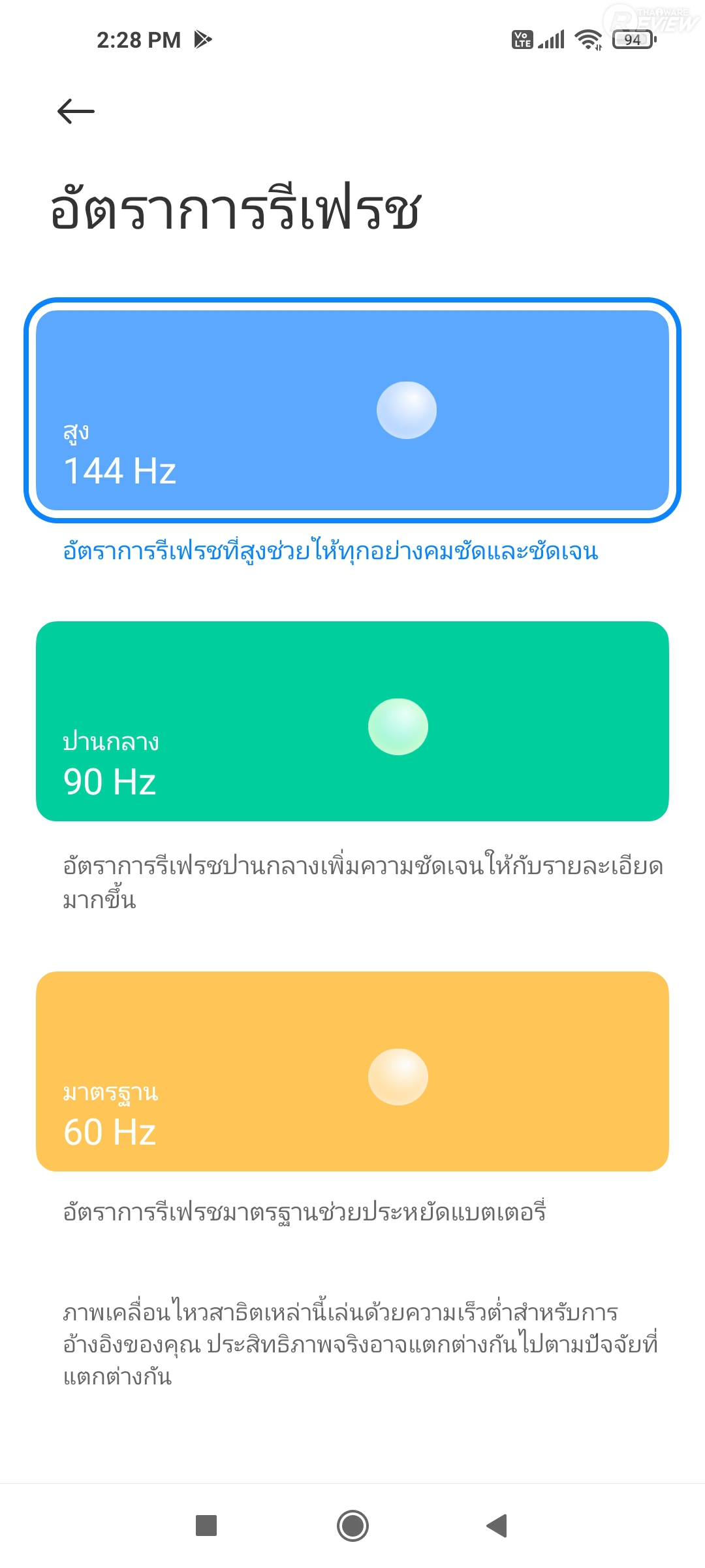 โดยในมือถือ Mi 10T Pro 5G มีอัตรารีเฟรชเรตหน้าจอให้เลือก 3 แบบ ได้แก่ 60 Hz, 90 Hz และ 144 Hz แนะนำว่าให้ตั้งค่าเป็น 144 Hz ไปเลย จะพบว่าการแสดงภาพลื่นไหลกว่าหน้าจอ 60 Hz มากๆ ส่วนใครที่ห่วงว่าจะทำให้เปลืองแบตเตอรี่ไหม ขอบอกว่านี่เป็นเพียงส่วนเล็กๆ ที่ไม่มีผลมากนัก และแบตเตอรี่ของมือถือ Mi 10T Pro 5G ก็ถือว่าเยอะเพียงพอต่อการใช้งาน 1 วันอยู่แล้ว