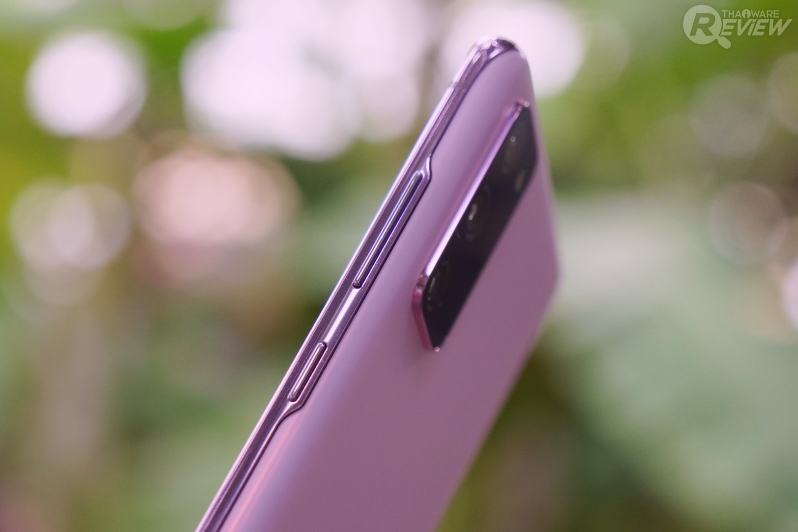 ดีไซน์ของมือถือ Samsung Galaxy S20 FE มีความคล้ายกับรุ่นพี่อย่างมือถือ Galaxy S20 และ S20+ แต่มีความแตกต่างของขอบมุมหน้าจอและโมดูลกล้องหลัง แถมยังมีให้เลือกถึง 6 สี 6 แบบ แต่สีขาว Cloud White และสีส้ม Cloud Orange มีให้เลือกซื้อบนเว็บไซต์ Samsung Official เท่านั้น ส่วนเครื่องที่ได้มานั้น เป็นสีม่วง Cloud Lavender ที่ดูในบางมุมแล้วเหมือนสีชมพูมากกว่า และแม้ตัวเครื่องจะบางเพียง 8.4 มิลลิเมตร แต่ก็ยังจับถนัดมือ ใช้งานได้สะดวกดีในมือเดียว