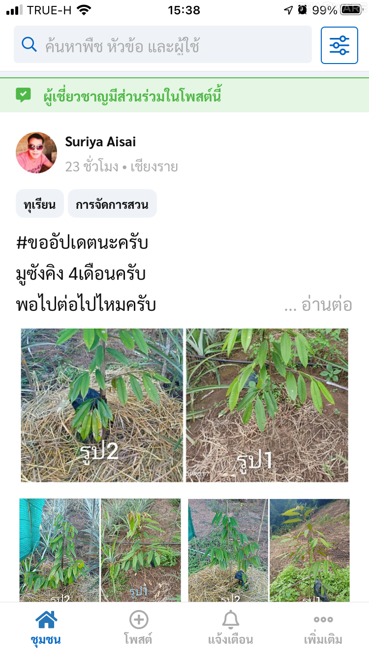เมื่อเลื่อนลงด้านล่าง เราก็จะได้เห็นโพสต์ต่างๆ ที่ผู้ใช้ในชุมชนเกษตรกรแห่งนี้มาร่วมถกปัญหาในการปลูกพืชต่างๆ กัน เป็นประโยชน์กับผู้ที่อาจมีปัญหาในลักษณะที่คล้ายกันหรือเหมือนกันด้วย