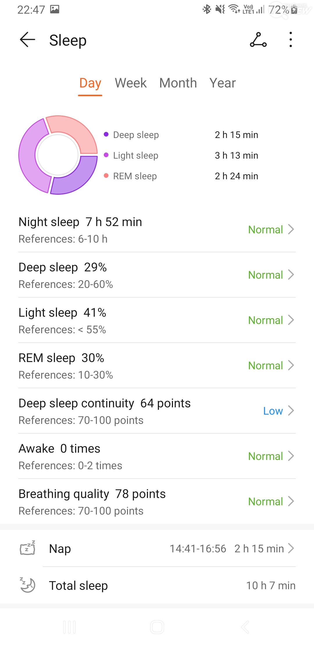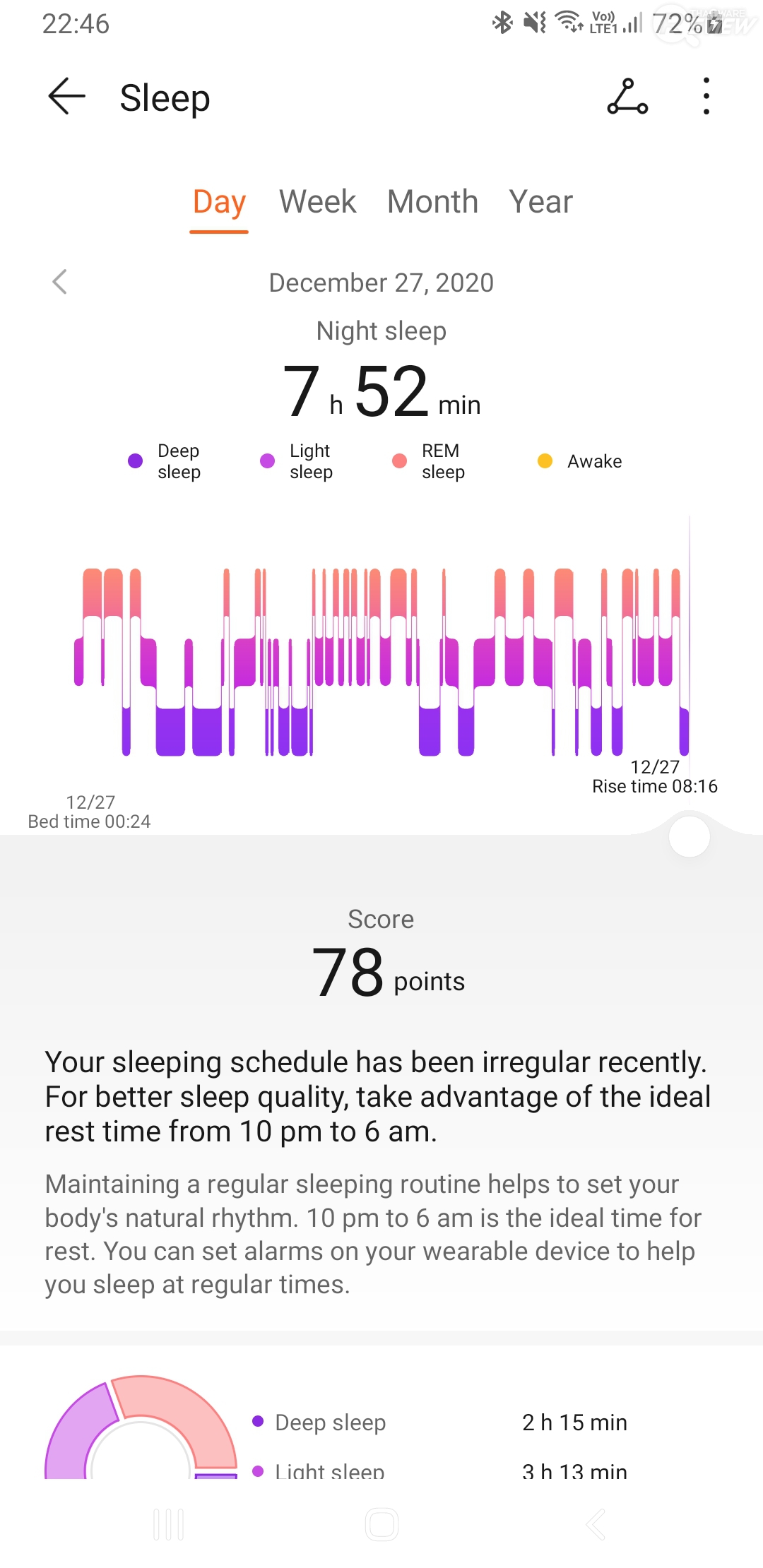 สำหรับการวัดค่าขณะนอนหลับบนนาฬิกา HUAWEI Watch GT 2 Pro ถือว่าทำได้ละเอียดมากๆ เมื่อใช้งานคู่กับแอปพลิเคชัน Health ซึ่งแบ่งค่าออกเป็นข้อมูล Awake ช่วงตื่นระหว่างหลับ, REM Sleep ช่วงที่เริ่มหลับ สำหรับบางคนอาจเป็นช่วงที่กำลังฝัน, Light Sleep ช่วงหลับตื้น และ Deep Sleep ช่วงหลับลึก ซึ่งคุณภาพการนอนหลับที่ดีจะต้องมีทั้งช่วง REM Sleep สลับกับช่วงหลับตื้นและหลับลึกอย่างพอดี หรือสังเกตได้จากการตื่นนอนว่าสดชื่น กระปรี้กระเปร่าไหม นอกจากนี้ นาฬิกายังสามารถบันทึกค่าเมื่องีบระหว่างวันได้ด้วย