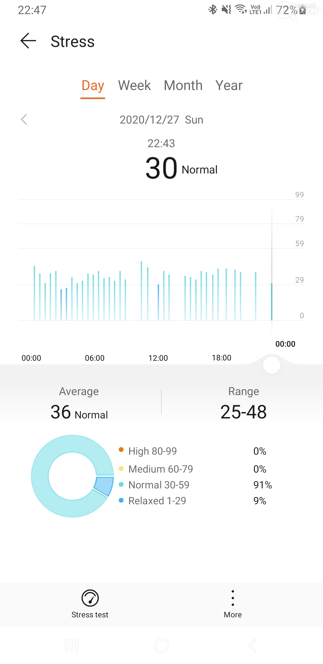 ส่วนการวัดระดับความเครียด ในนาฬิกา HUAWEI Watch GT 2 Pro สามารถวัดได้แบบ Realtime เช็คค่าในตัวนาฬิกาหรือแอปพลิเคชัน Health ก็ได้ ซึ่งระบบจะแบ่งความเครียดออกเป็น 4 ส่วน ได้แก่ Relaxed สีน้ำเงิน, Normal สีฟ้า, Medium สีเหลือง และ High สีแดง ซึ่งการแสดงผลแบ่งออกเป็นสถิติตามวัน สัปดาห์ เดือนและปี ออกมาเป็นกราฟอ่านง่าย และยังมี Stress Test ด้วยการวัดอัตราการเต้นของหัวใจเป็นเวลา 1 นาทีติดต่อกัน และวางมือนิ่งๆ เพื่อวัดค่าอย่างแม่นยำที่สุด