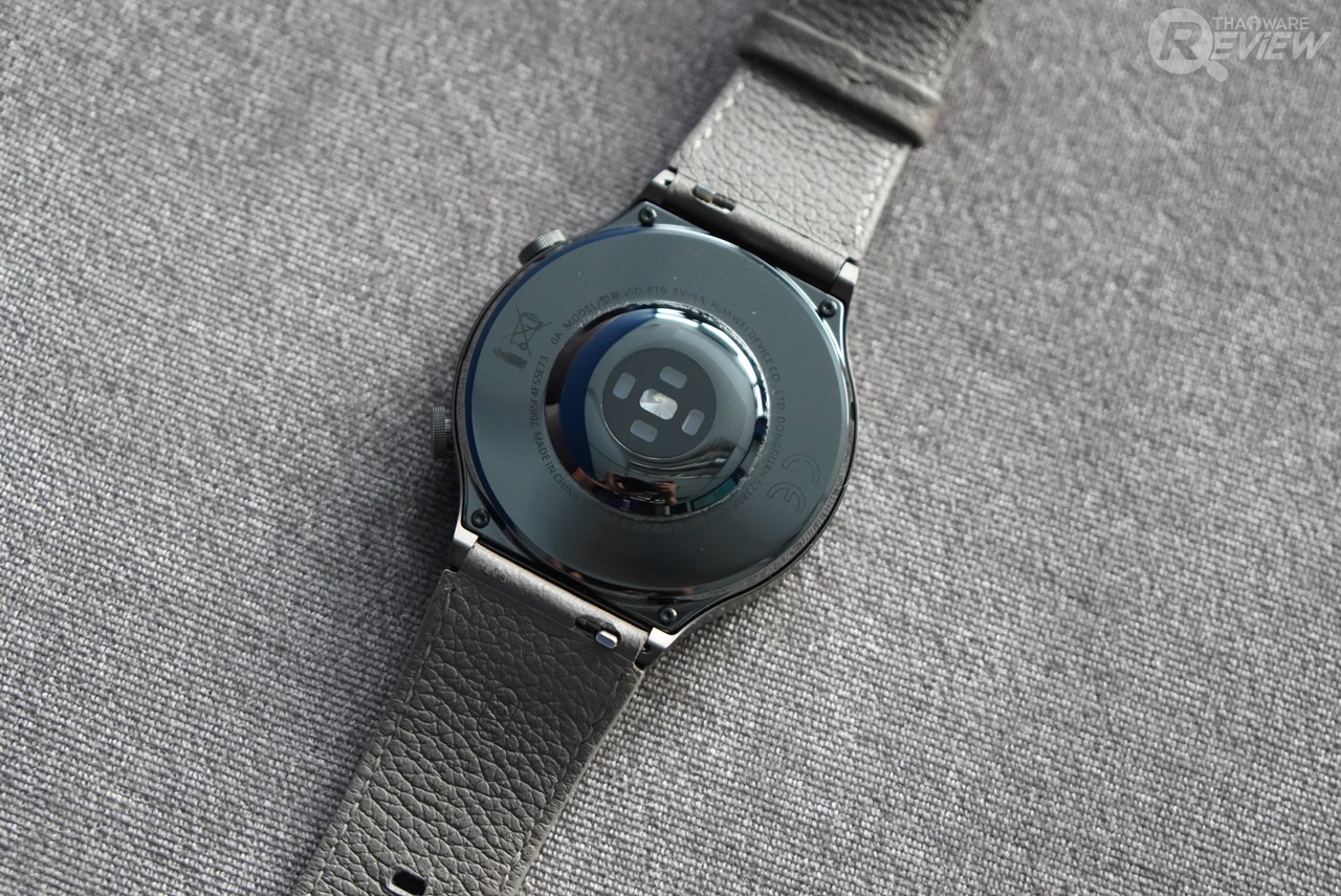 ด้านหลังมีเซนเซอร์วัดอัตราการเต้นของหัวใจ ซึ่งรุ่นนี้วัดได้ทั้ง Heart Rate, Stress วัดความเครียด และวัด SpO2 วัดระดับความอิ่มตัวของออกซิเจนในเลือดแบบคร่าวๆ ได้ นอกจากนี้ บริเวณขอบนาฬิกาด้านหลังยังมีช่องลำโพงในตัว สำหรับฟังเพลงและสนทนาทางโทรศัพท์ แต่ถ้าใครไม่ชอบหรือกลัวเสียงดัง สามารถเชื่อมต่อหูฟังไร้สายผ่านบลูทูธแทนได้