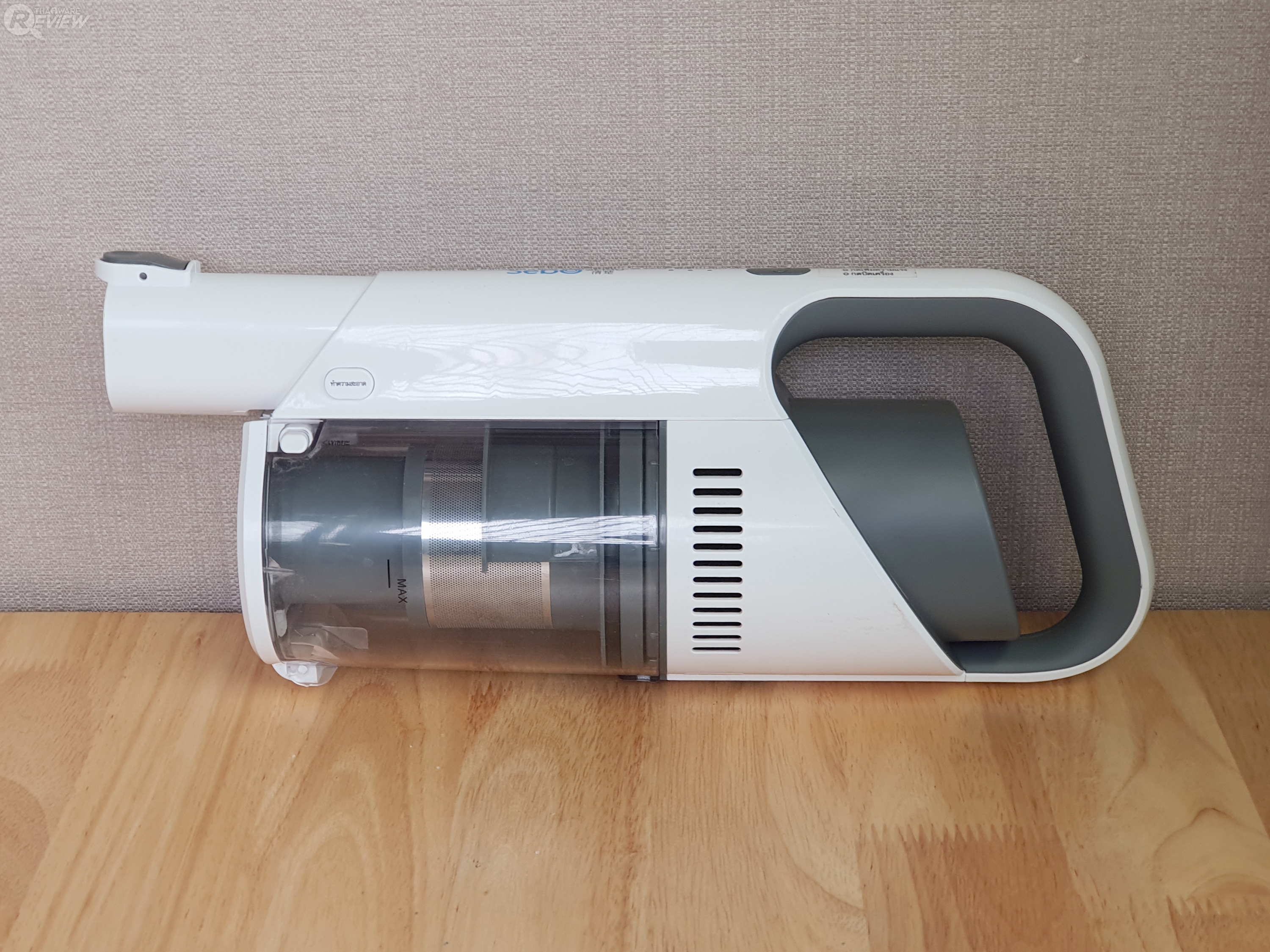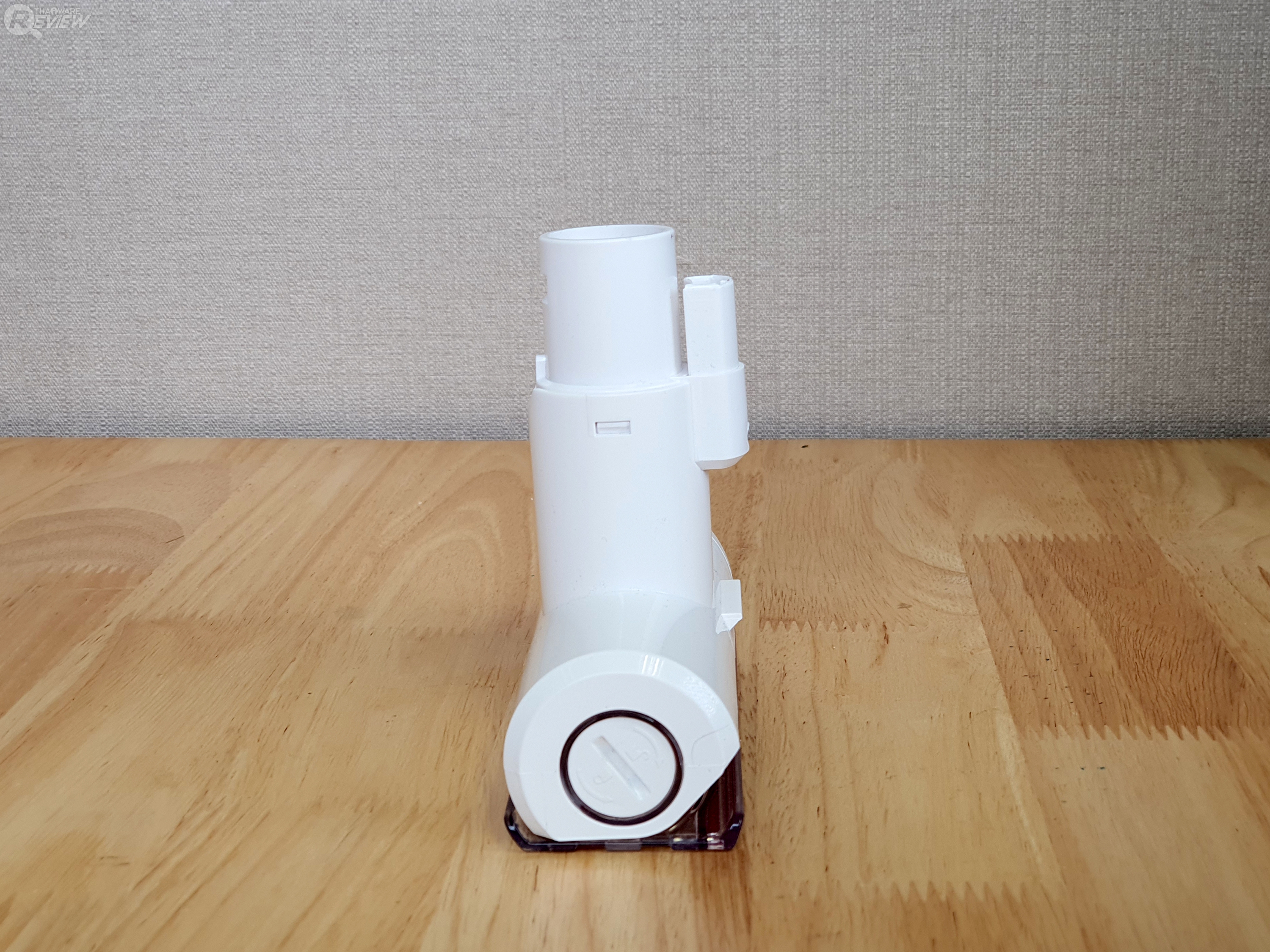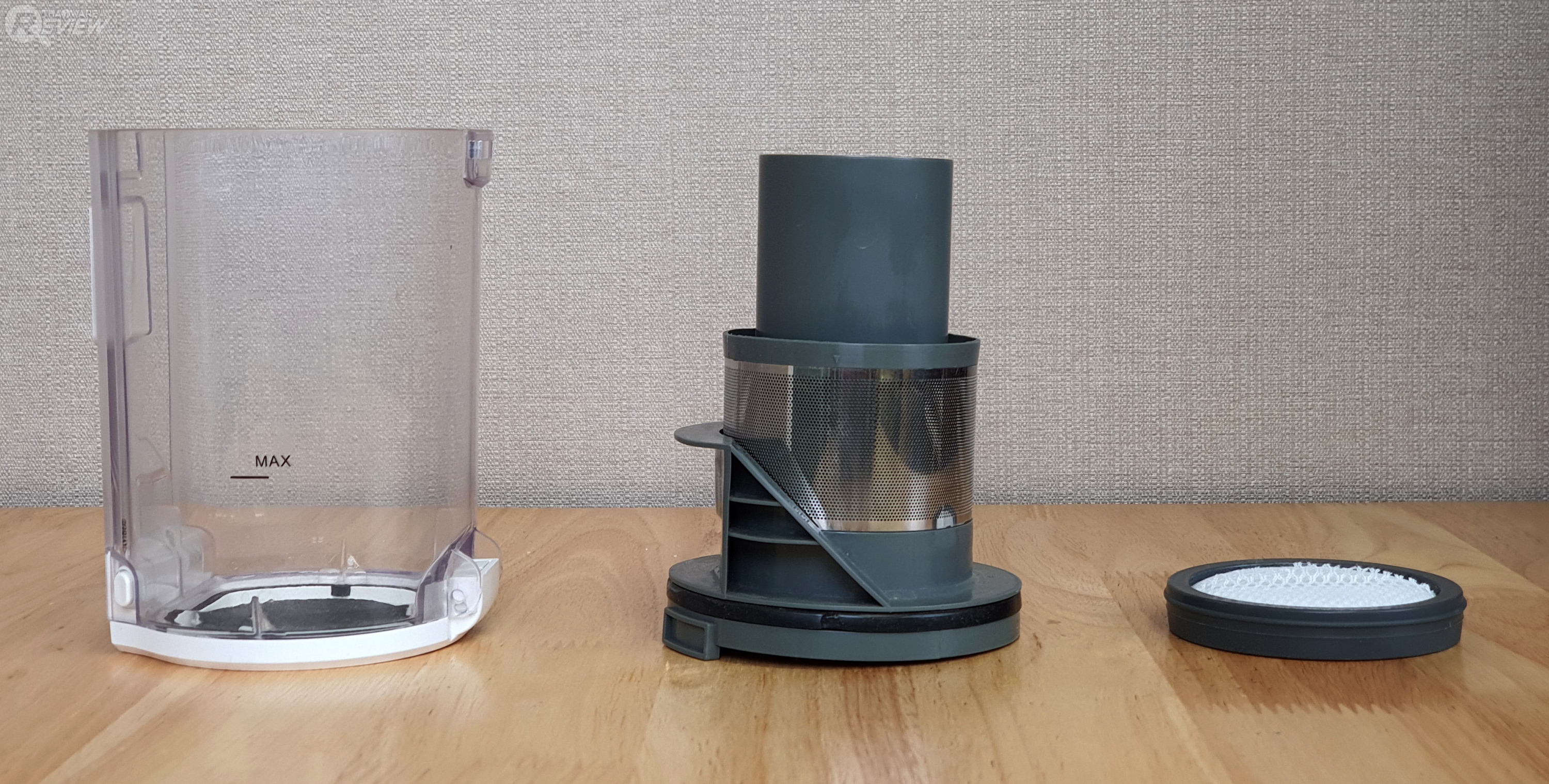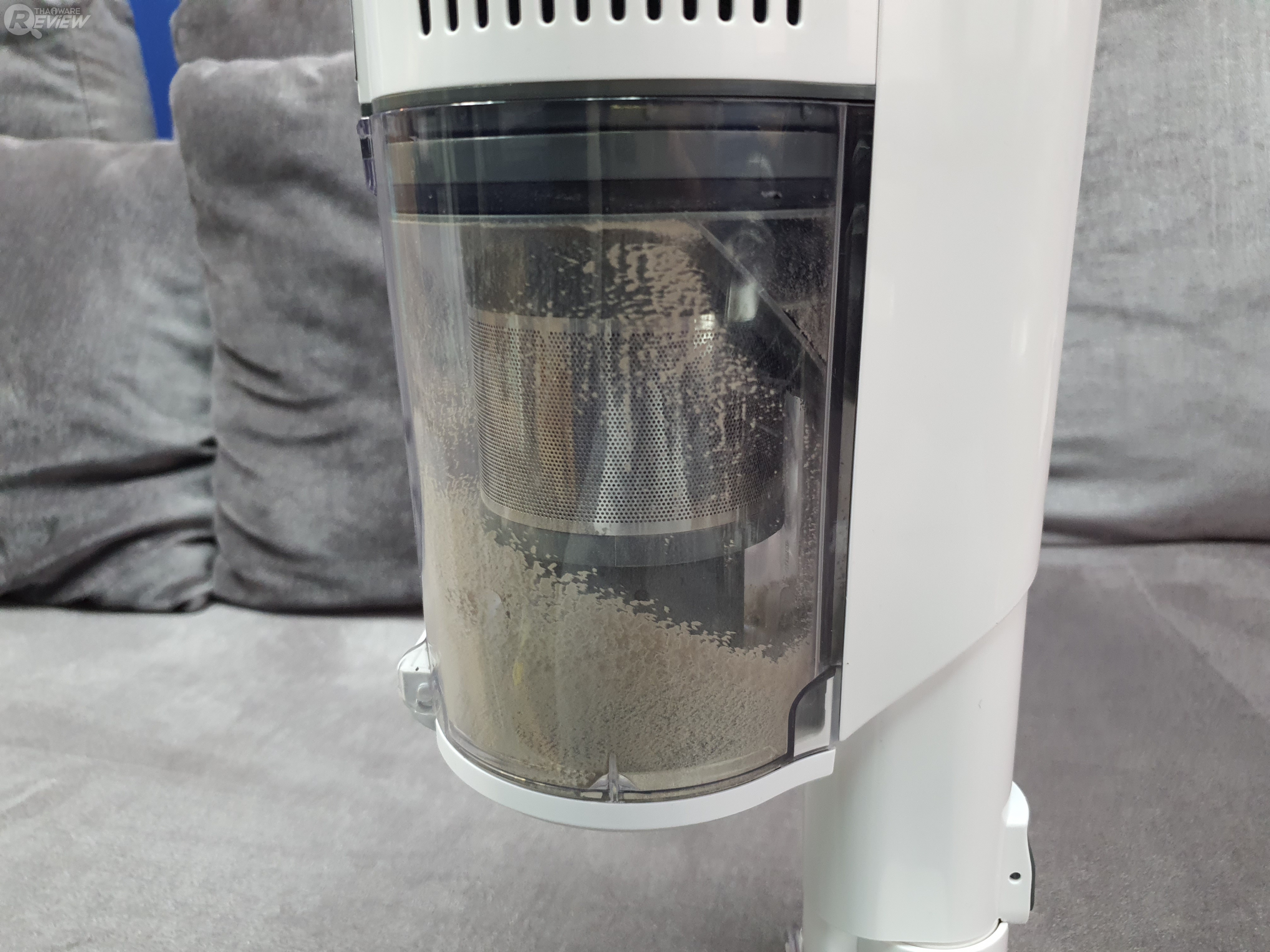 สำหรับตัวถ้วยเก็บฝุ่นขนาด 500 มิลลิลิตร ก็ค่อนข้างมาตรฐาน ถ้ามากกว่านี้ก็คงจะใหญ่ไป ซึ่งก็มาพร้อมกับระบบไซโคลน ที่จะช่วยจัดการแยกฝุ่นผงกับขยะชิ้นใหญ่เพื่อไม่ให้แรงดูดของเครื่องดูดฝุ่นตกนั่นเอง สามารถเปิดฝาใต้ถ้วยเทฝุ่นผง ขยะต่าง ๆ ได้ทันที รวมทั้งสามารถปลดทั้งถ้วย ตัวไซโคลนและไส้กรองมาทำความสะอาดได้