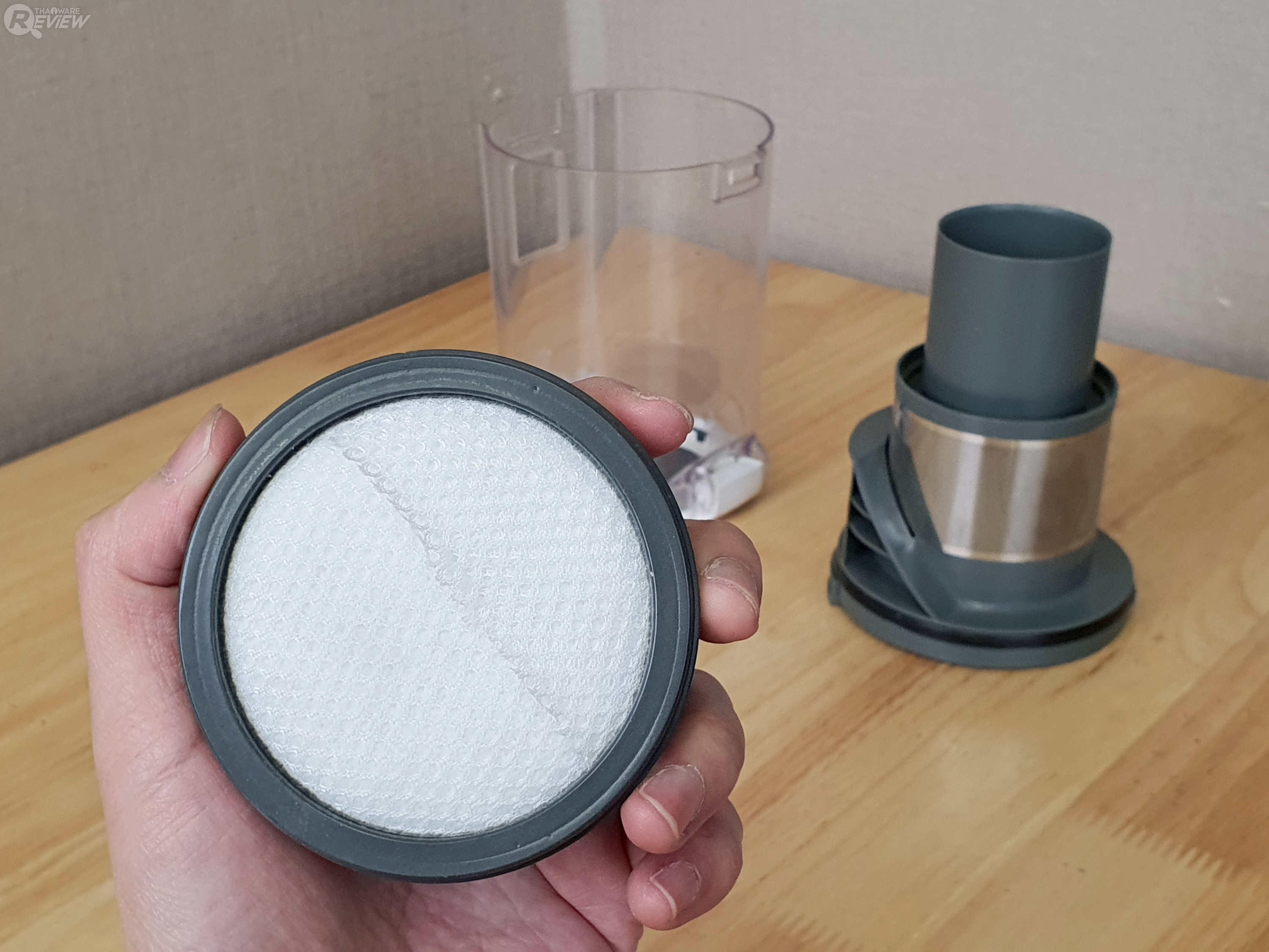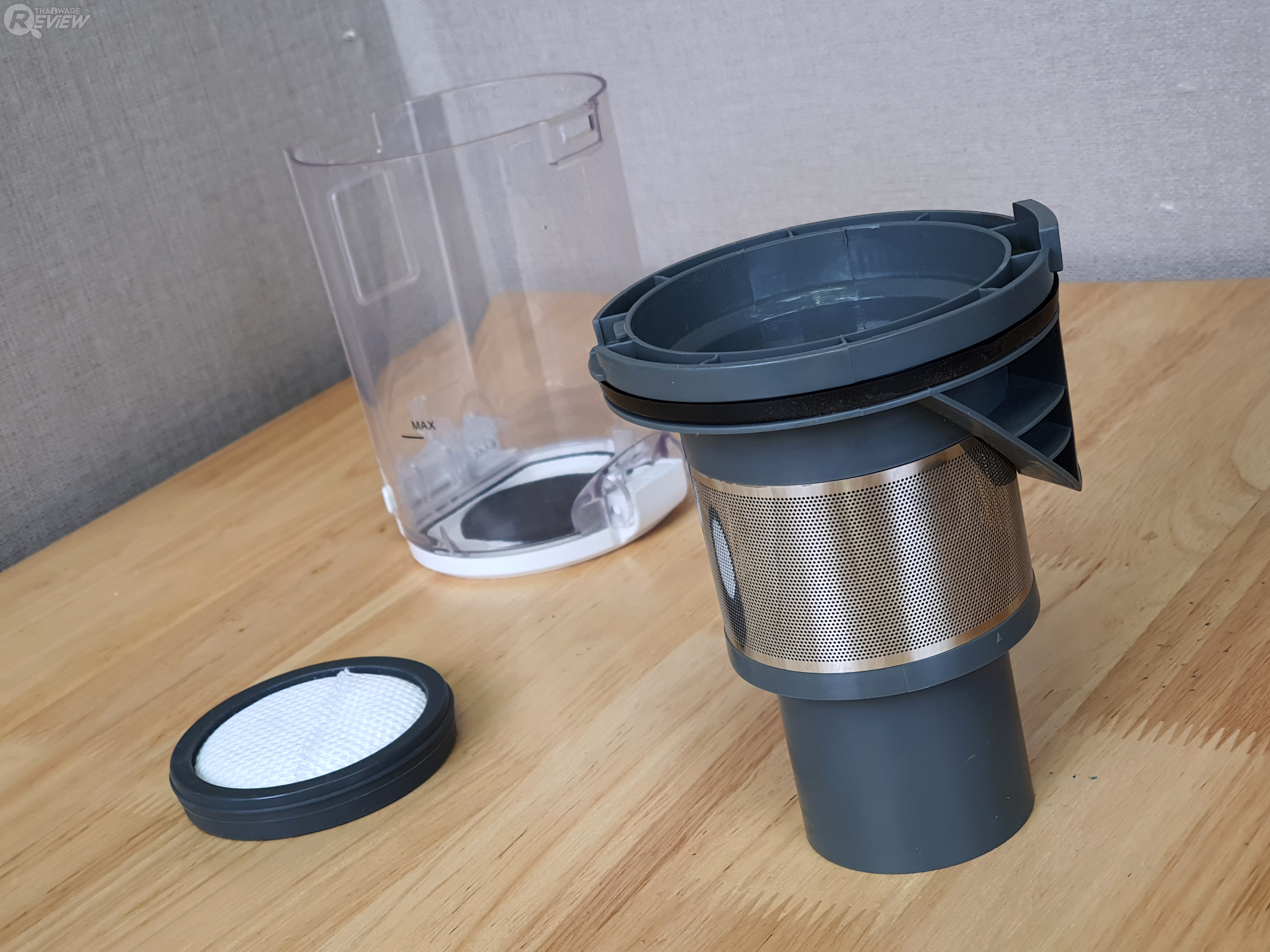 ตัวถ้วยเก็บฝุ่นจะแยกได้ออกเป็น 3 ชิ้น ได้แก่ ถ้วยเก็บฝุ่น ตัวไซโคลน และแผ่นกรอง ซึ่งอุปกรณ์ทั้ง 3 ชิ้นบนตัวกล่องแจ้งไว้ว่าเป็นอุปกรณ์แบบที่สามารถล้างทำความสะอาดได้ (Washable) ซึ่งเอาจริง ๆ แล้วสำหรับตัวแผ่นกรองเราไม่ค่อยแนะนำให้ล้างทำความสะอาดเท่าไหร่นะ อาจจะแค่เช็ดหรือเป่าทำความสะอาดก็เพียงพอ