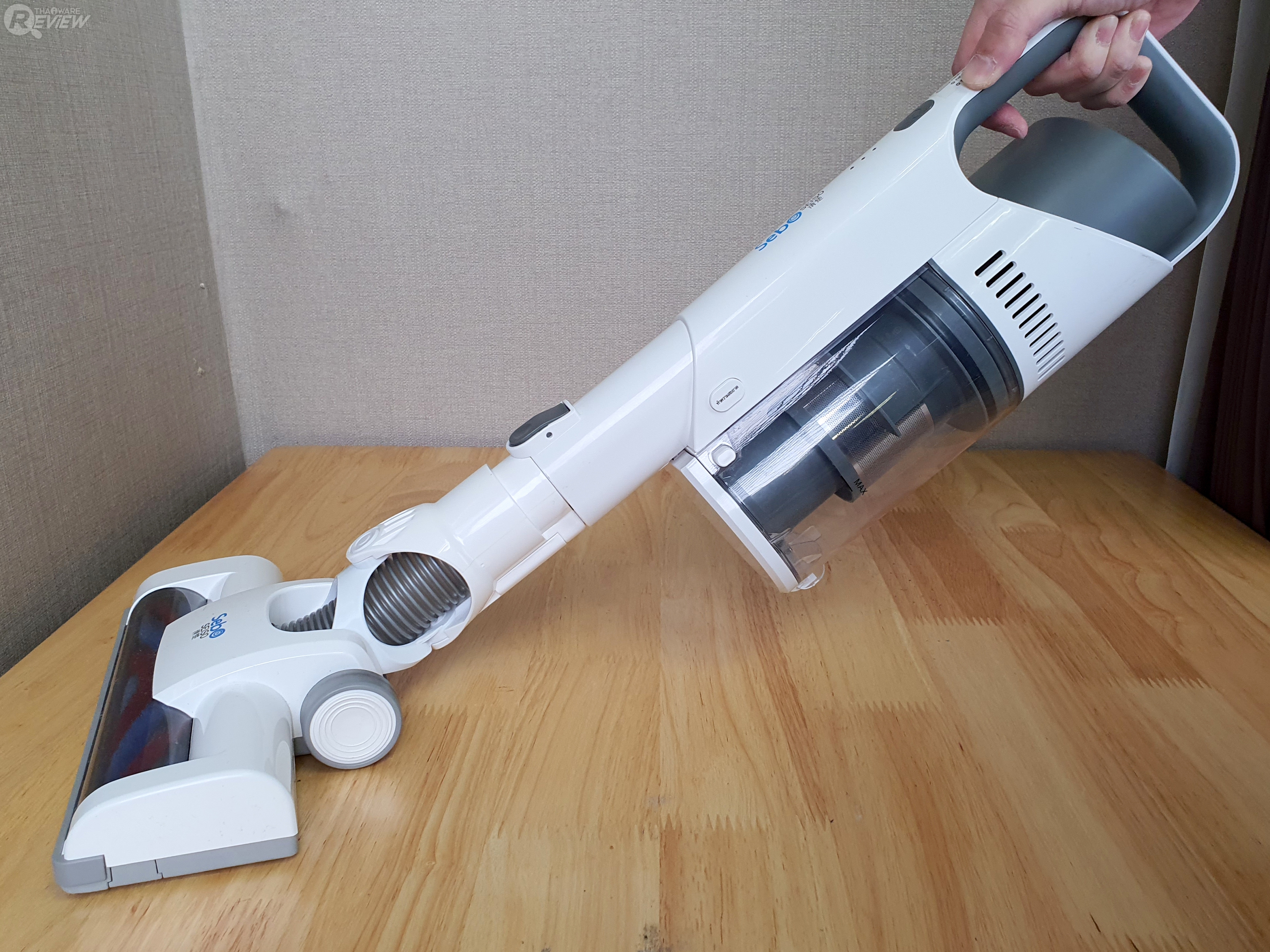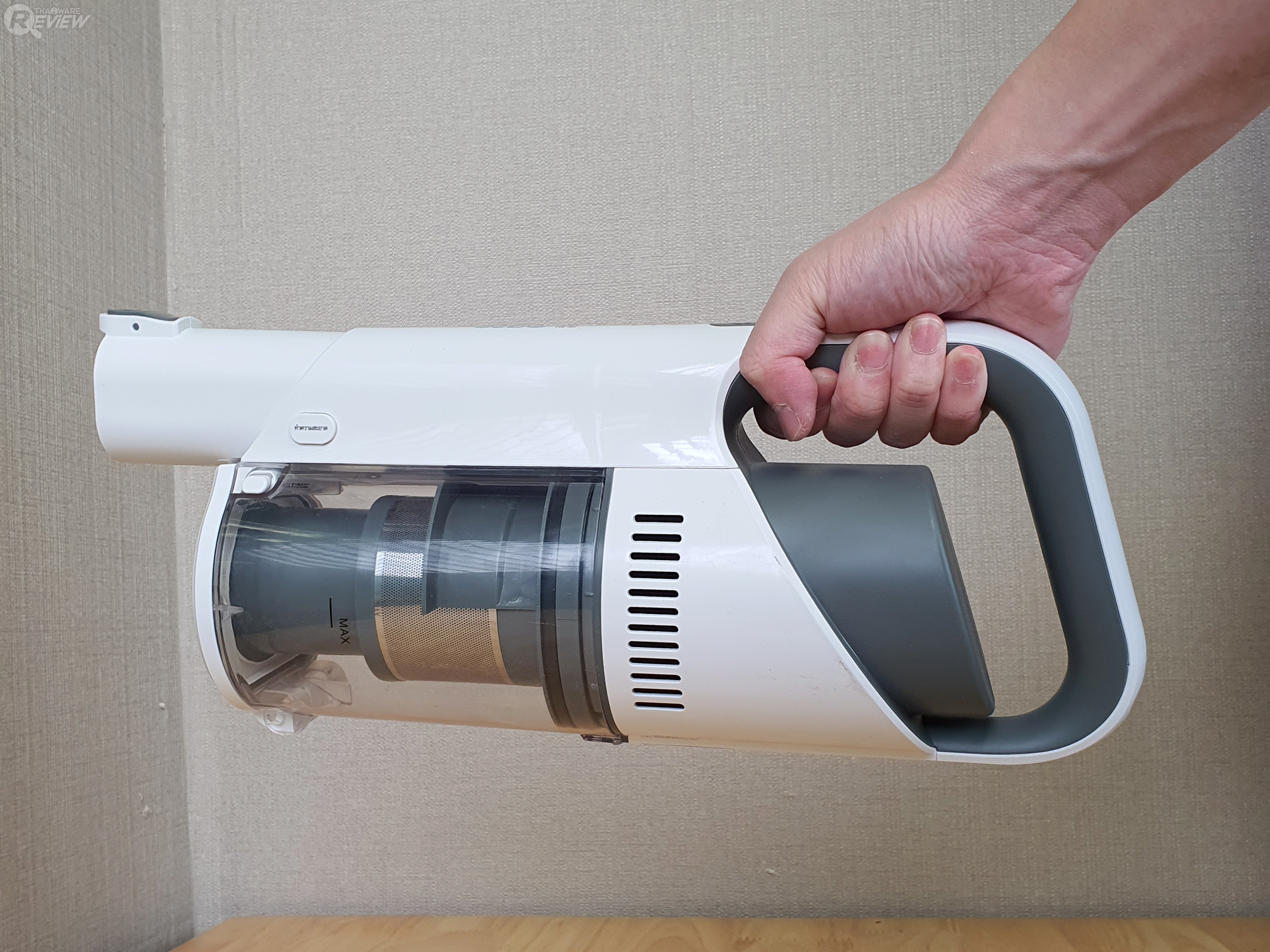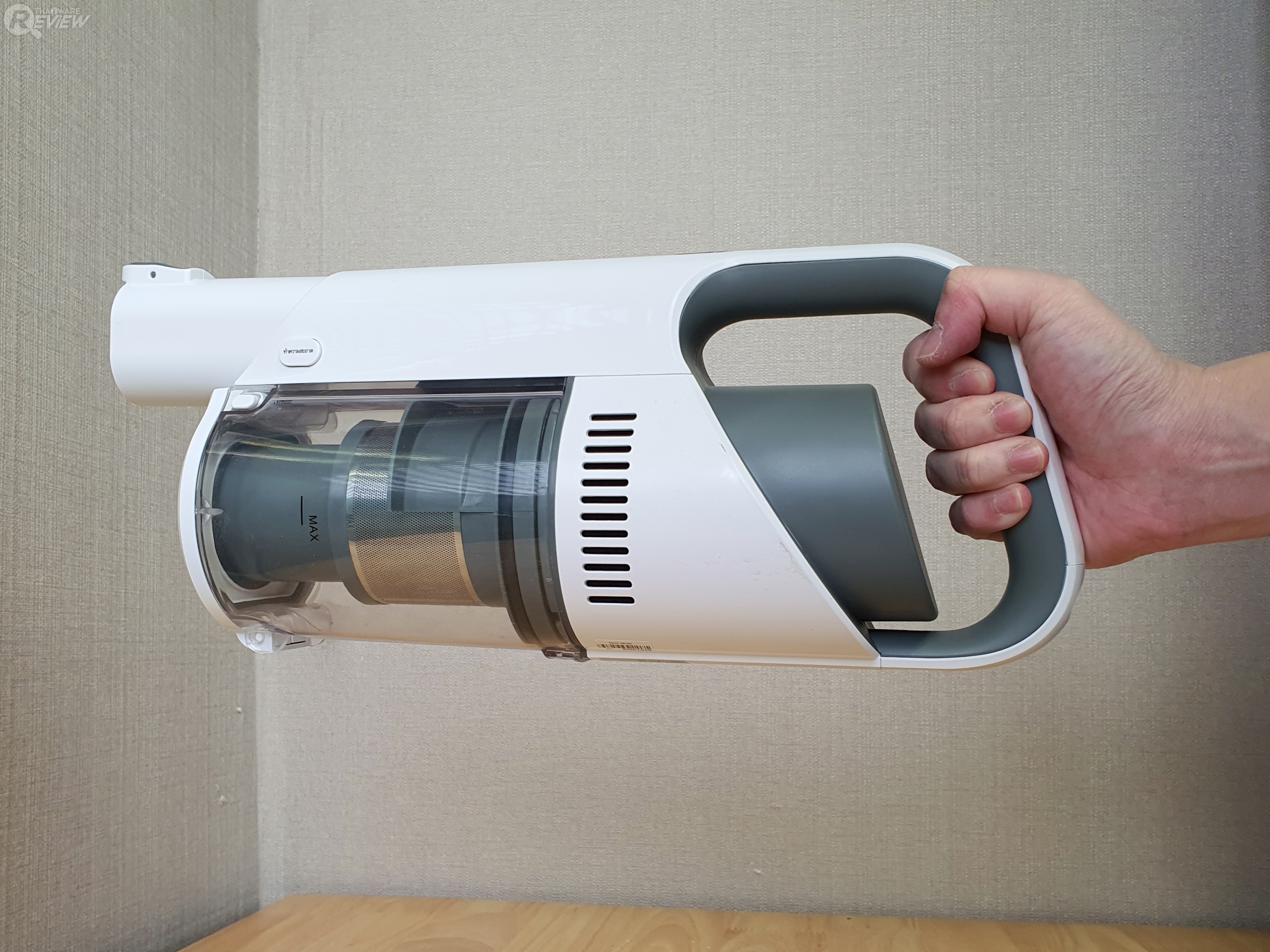 ด้ามจับเป็นรูปตัวเจ (J) มุมมน ขณะจับถือมือจะอยู่เหนือตัวเครื่องในลักษณะการหิ้วทำให้เราไม่ต้องรับน้ำหนักเครื่องเยอะ และการที่ด้ามจับครอบคลุมทั้งด้านบนและด้านหลัง ทำให้ระหว่างการทำความสะอาดพื้น เราสามารถเลื่อนมือที่จับตามระยะการใช้งานได้ ลากไกลตัวจับด้านหลัง ลากใกล้ตัวหรือเอื้อมไปกดปุ่มก็จับด้านบน บวกกับน้ำหนัก 1.2 กิโลกรัม ก็ถือว่าไม่ได้หนักมาก ใส่กับแปรงเล็ก ๆ ถือใช้งานได้สบายเลย