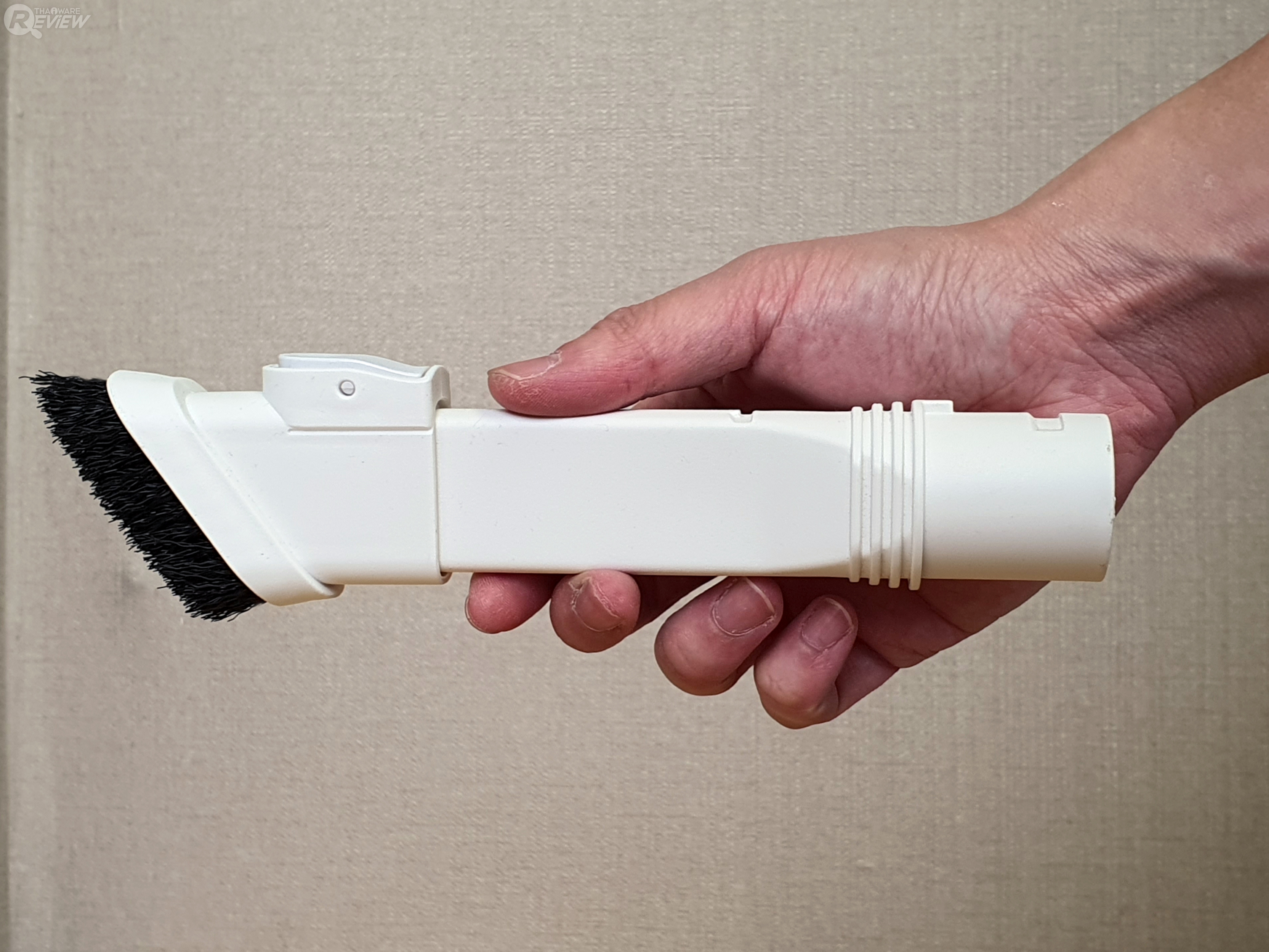 ถึงแม้ว่าจะเป็นเครื่องดูดฝุ่นระดับเริ่มต้นที่ราคาไม่สูง แต่ข้อต่อต่าง ๆ ก็มีตัวล็อกที่สามารถกดเพื่อปลดได้ง่าย ๆ แม้แต่แปรงเล็ก ๆ อย่างแปรงซอกซอน เพราะเครื่องดูดฝุ่นไร้สายบางแบรนด์ในตลาด จะใช้การเสียบท่อเข้าไปตรง ๆ และใช้แรงในการดึงออก ซึ่งถ้าผู้ใช้ตัวเล็กหรือไม่มีแรง ก็จะหมดสิทธิ์เปลี่ยนแปรงเองเลย ตรงนี้ค่อนข้างประทับใจ