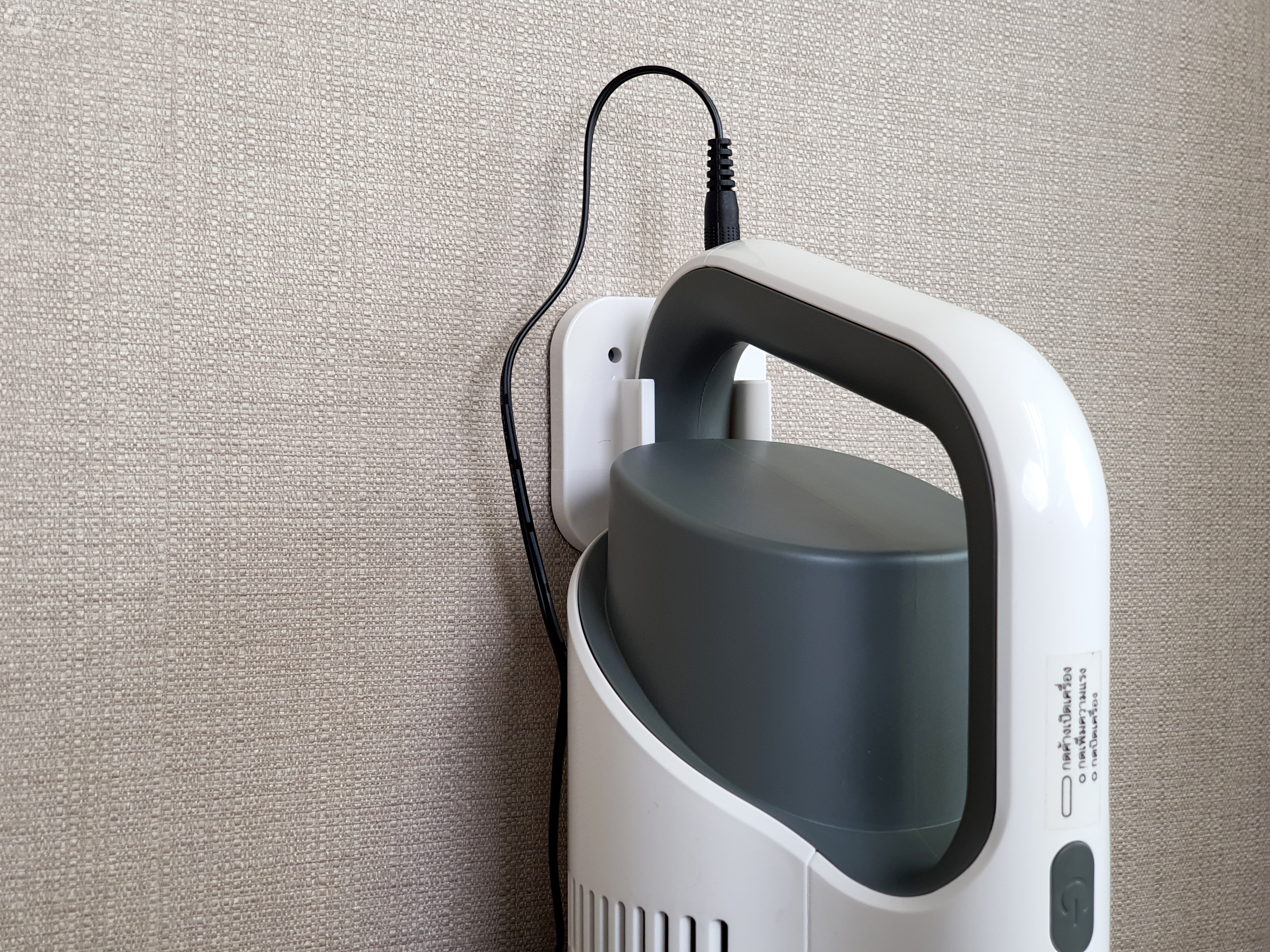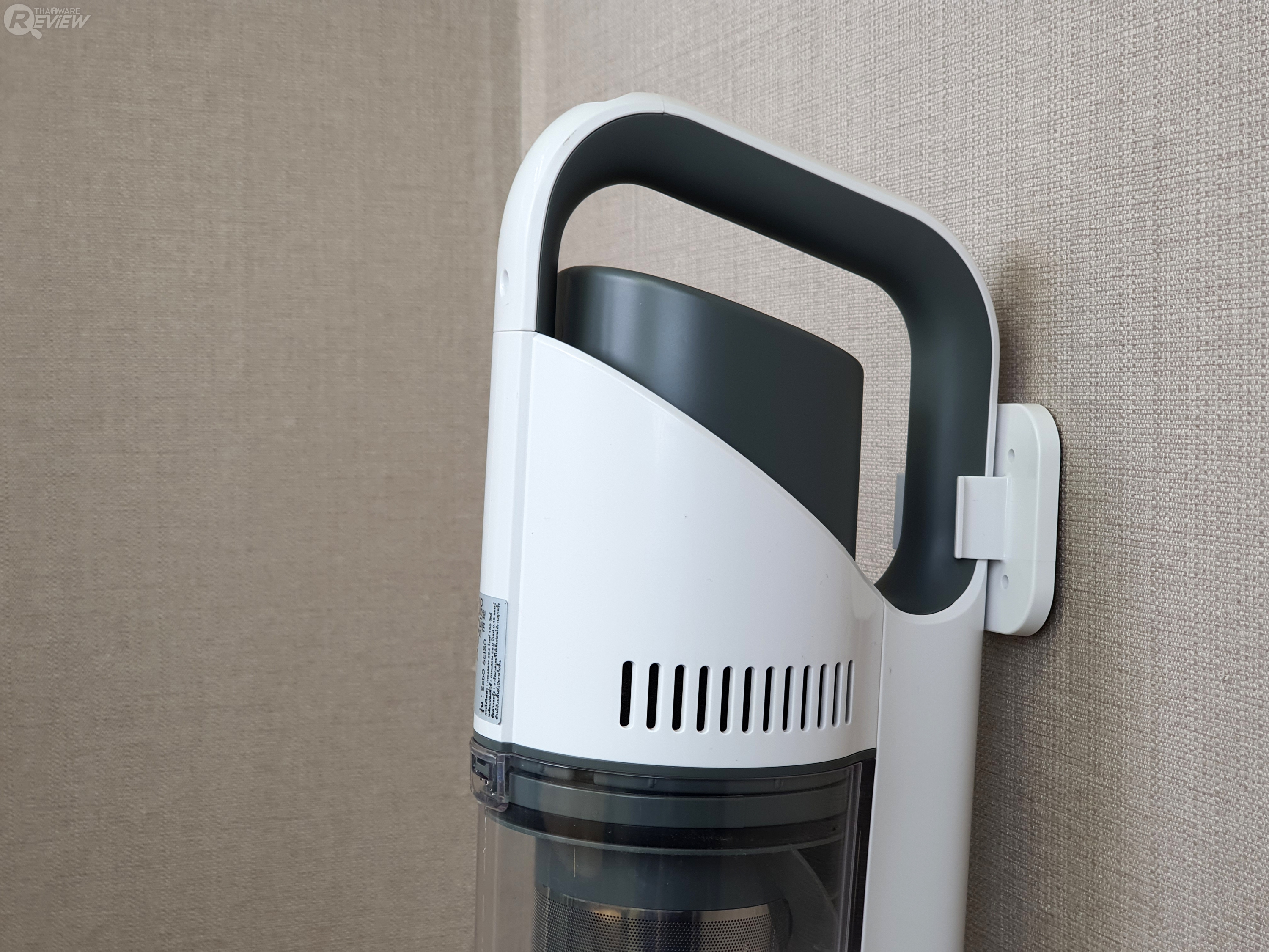 จริง ๆ แล้วดูเหมือนว่าแท่นติดผนังจะทำขอบมาพอดีกับด้ามจับอีกฝั่งที่มีความหนามากกว่า ซึ่งทำให้ล็อกได้แน่นกว่าแต่ก็ไม่เหมาะที่จะล็อกด้านนี้ เพราะหัวแปรงดูดพื้นจะติดขอบผนัง ไม่สามารถวางตั้งอย่างมั่นคงได้