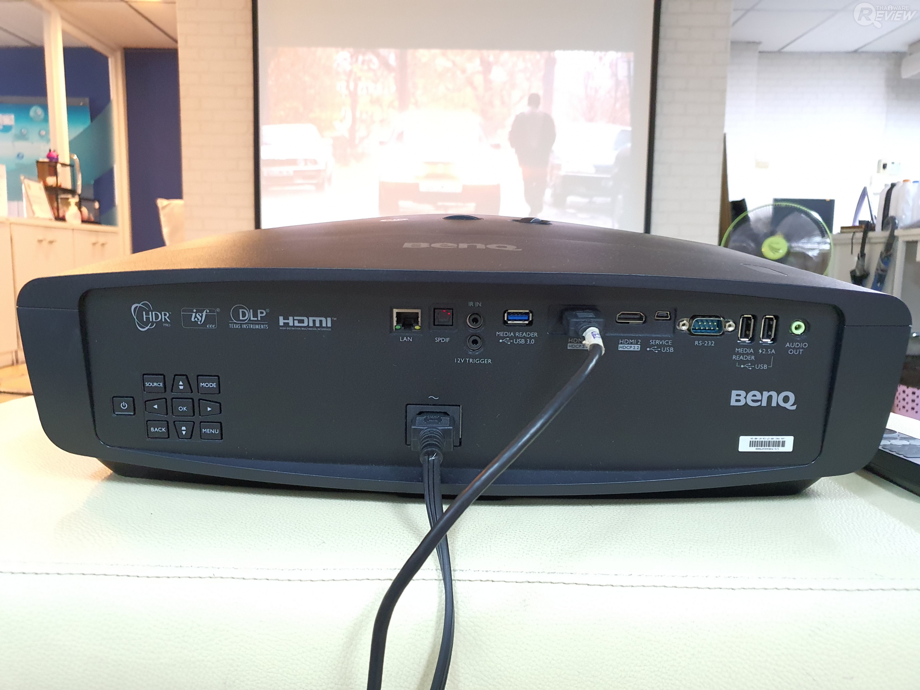 ส่วนบริเวณตรงกลางและด้านขวา ประกอบไปด้วยช่องเสียบสาย Power AC, พอร์ต LAN, พอร์ต SPDIF สำหรับเชื่อมต่อกับเครื่องเสียง, ช่องต่อ IR IN และ 12V TRIGGER วางคู่กัน, พอร์ต USB 3.0 1 ช่อง, พอร์ต HDMI 2 ช่องและช่อง miniUSB ส่วนถัดมาก็เป็นพอร์ตเชื่อมต่อ RS232, พอร์ต USB สำหรับอ่านไฟล์และชาร์จไฟ ปิดท้ายด้วยช่อง Audio Out สำหรับใช้ร่วมกับเครื่องขยายเสียงหรือลำโพง