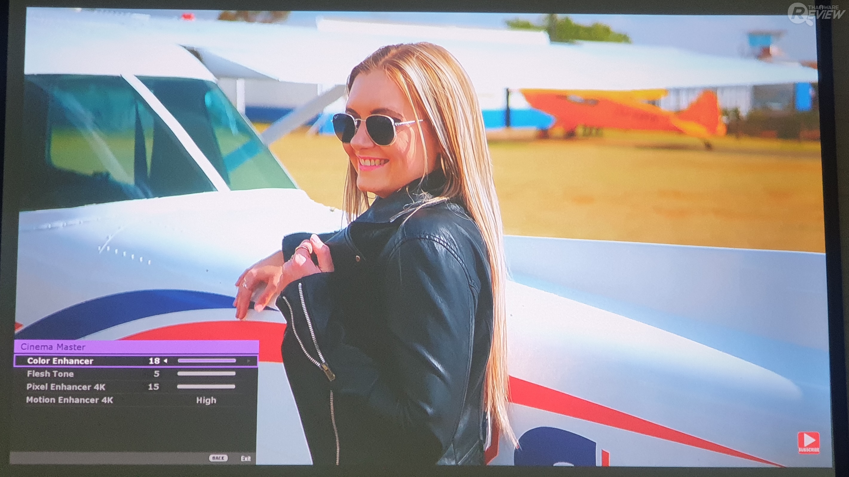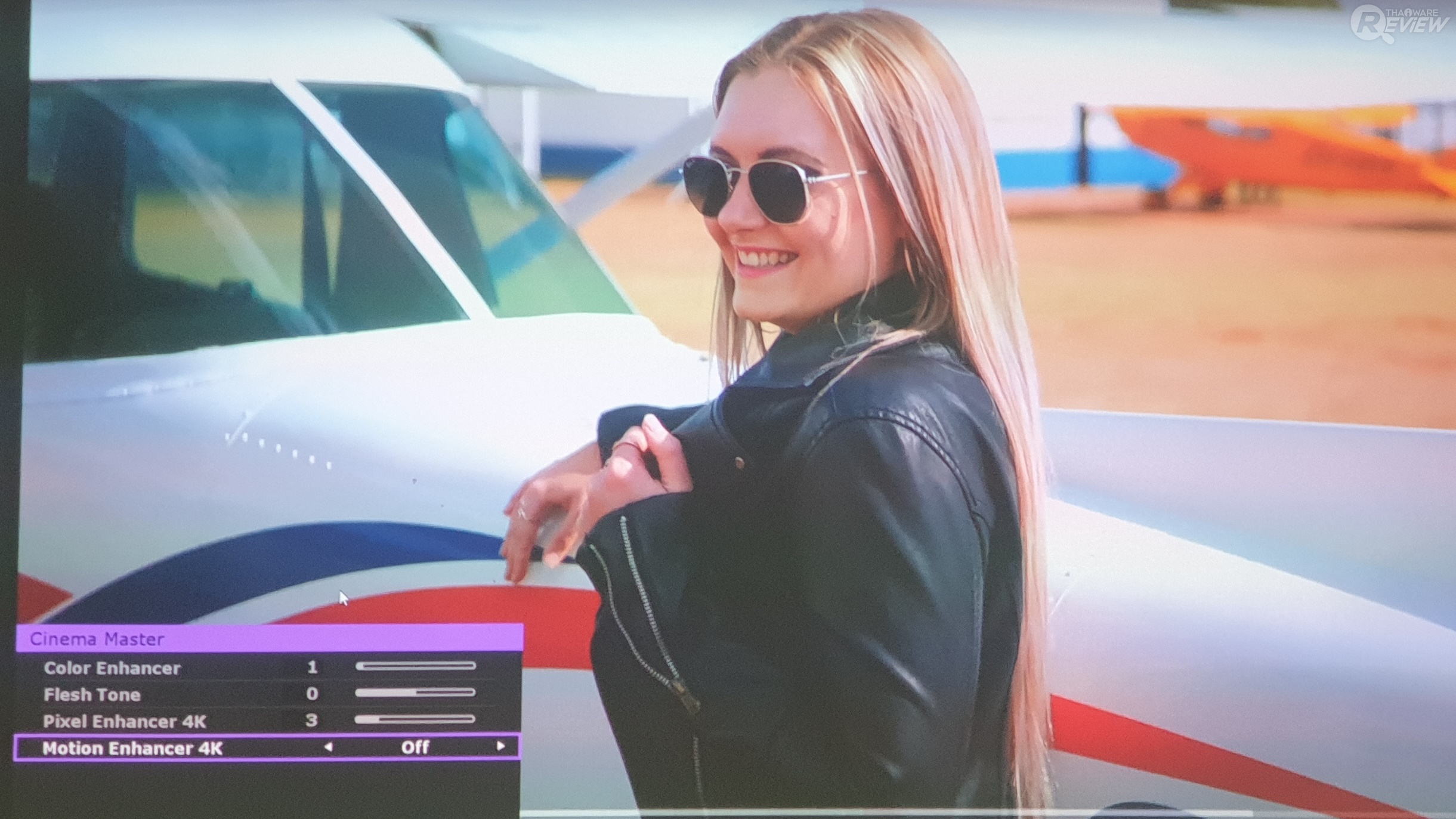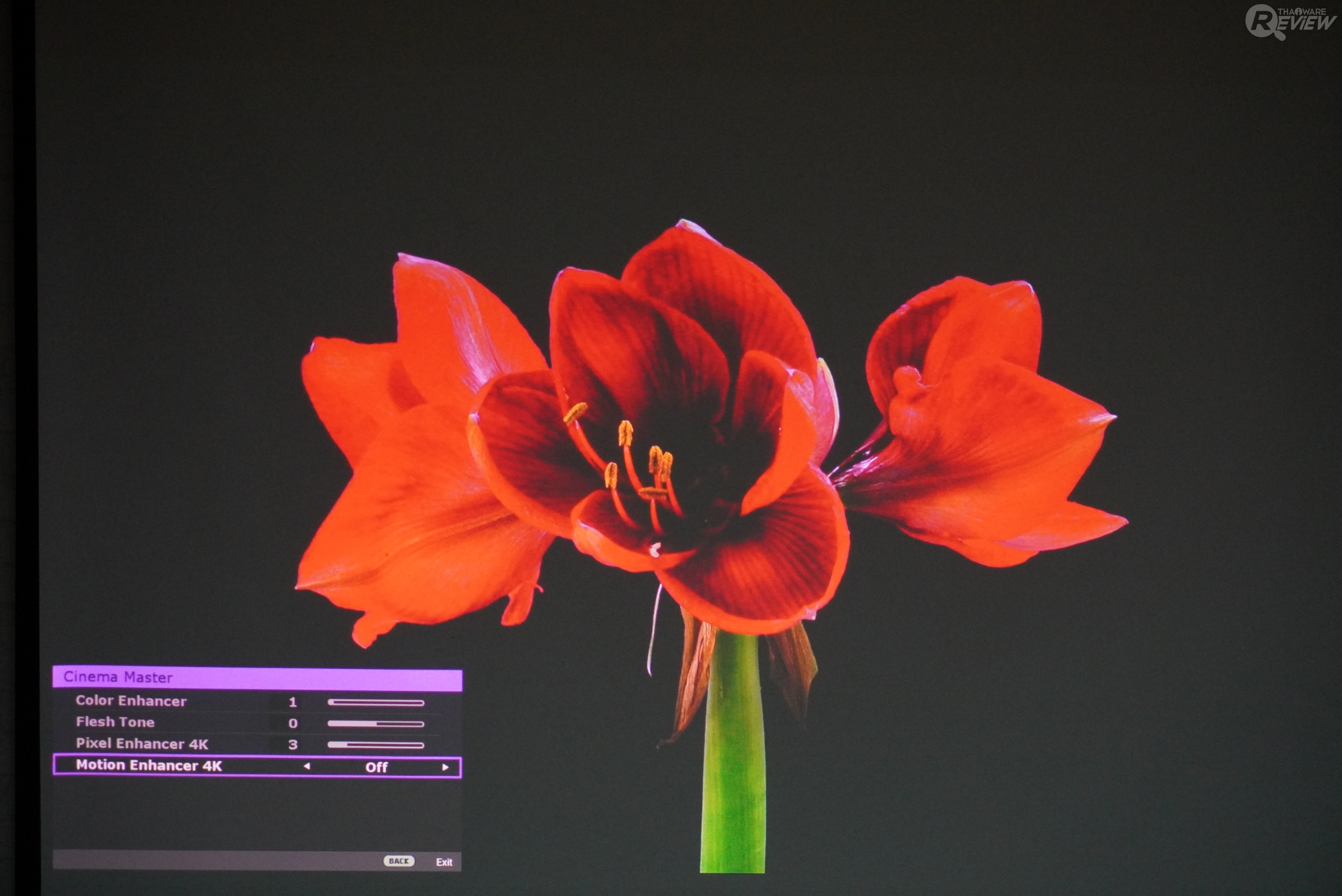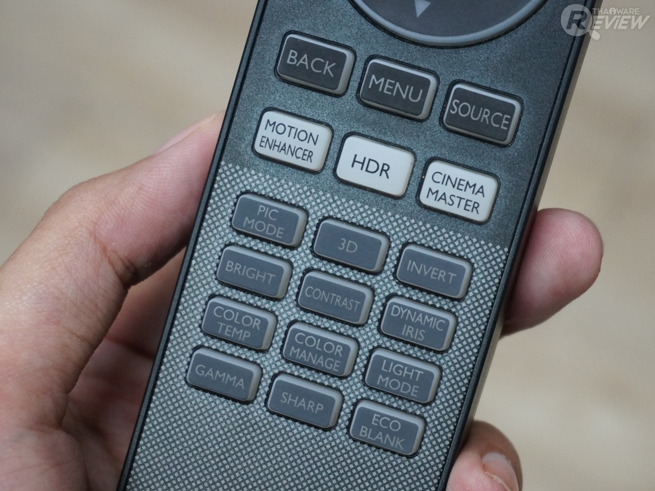 นอกจาก "ปุ่ม MENU" แล้ว บริเวณส่วนล่างของรีโมทจะเป็น "ปุ่ม Picture Mode" แบบต่าง ๆ เลือกได้ทั้ง PIC MODE, Color Temp อุณหภูมิสีของภาพ, ปรับ Contrast, ปรับ Dynamic Iris ไปจนถึงโหมดสีที่เป็นจุดเด่นของรุ่นนี้ ทั้ง Motion Enhancer สำหรับวิดีโอ 4K, และ Cinema Master เพื่อให้แสงสีขณะฉายภาพยนตร์คล้ายกับการฉายในโรงมากขึ้น ส่วนโหมด HDR เมื่อทดสอบเลือกบนรีโมท พบว่าเป็นโหมดที่เปิดใช้งานอัตโนมัติอยู่แล้ว