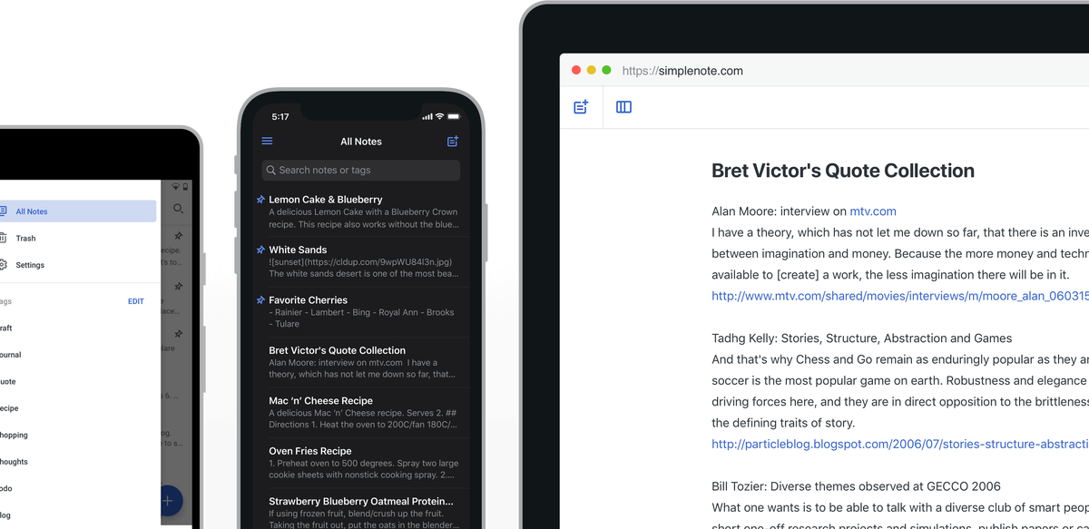 แอป Simplenote เป็นแอปพลิเคชันจดโน้ตที่มีความ "ซิมเพิล" (เรียบง่าย) สมชื่อ ไม่มีความซับซ้อนหรือฟีเจอร์ต่าง ๆ เข้ามา แต่นั่นก็หมายความว่ามันสามารถเอาไว้ใช้งานได้แค่จดโน้ตเท่านั้น และไม่สามารถเพิ่มไฟล์มีเดียอื่น ๆ, เก็บหน้าเว็บ, หรือผนวกเข้ากับอีเมลได้ อีกทั้งไม่มีตัวเลือกฟอร์แมตในการจดโน้ตอะไรทั้งนั้น เหมือนกับที่เราใช้กระดาษโน้ตกับปากกาทั่วไปอะไรแบบนั้น