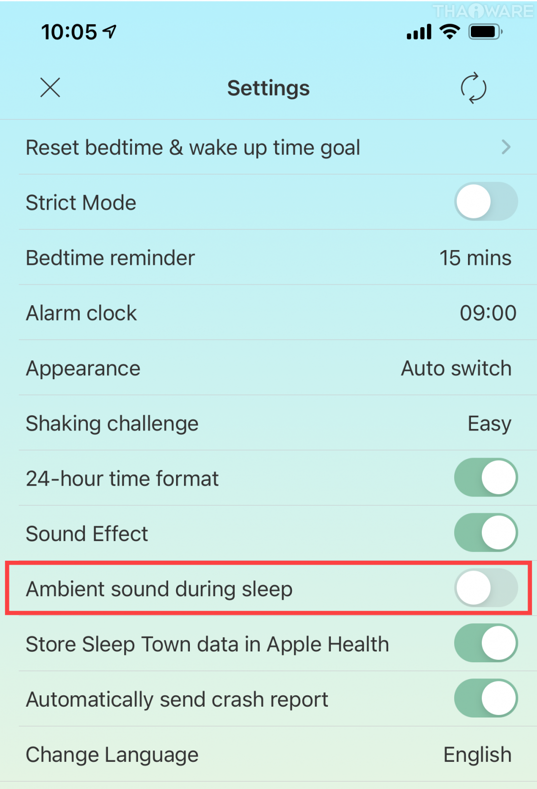 สำหรับคนที่หลับยาก ตัวแอปฯ มีฟีเจอร์ให้เลือกเปิดเสียงกล่อมหลับหลังจากที่เรากด "Sleep" แล้ว โดยสามารถเข้าไปเปิดฟีเจอร์เสียงดนตรีกล่อมหลับได้ที่ส่วนของ "การตั้งค่า (Settings)" แล้วหลังจากนั้นให้เลือก "Ambient sound during sleep" ซึ่งฟีเจอร์นี้มีดีตรงที่ พอเวลาผ่านไปสักระยะ เพลงจะดับให้เองโดยอัตโนมัติ (ไม่รู้ว่าดับเมื่อไหร่เหมือนกัน เพราะผู้เขียนหลับก่อนตลอด)
