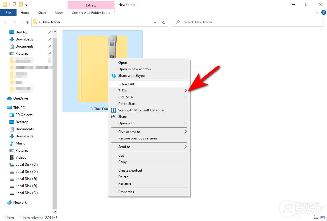 คลิกขวาที่ไฟล์ 13-Thai-Fonts.zip ที่เราดาวน์โหลดมา เลือก Extract All...