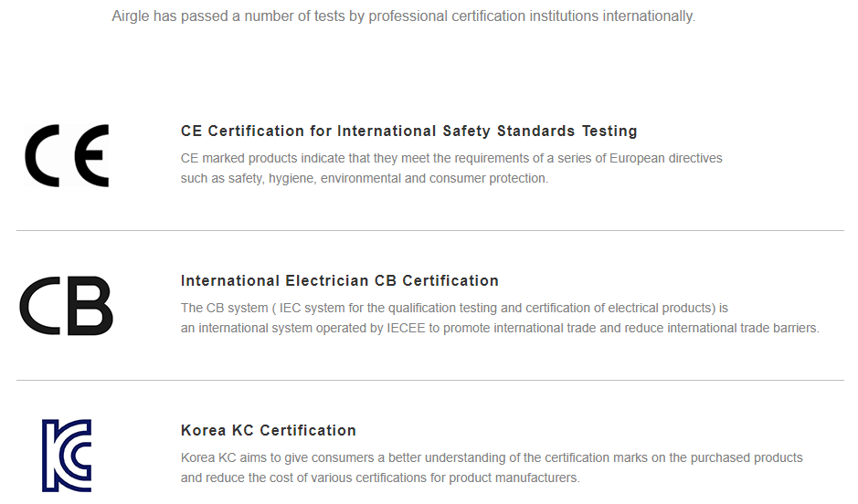นอกจากนี้ยังมาพร้อมกับการรับรองคุณสมบัติและความปลอดภัยในการทำงานของเครื่องใช้ไฟฟ้าจาก International Electrician CB Certification ในระดับนานาชาติ และ Korea KC Certification ของประเทศเกาหลีใต้