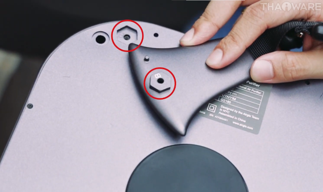 การแขวนใช้งานด้านหลังเบาะ ผู้ใช้จะต้องทำการติดตั้ง Mount สำหรับแขวนตัวเครื่องเข้ากับช่องด้านหลังเครื่องก่อน โดยสังเกตจากตัวอักษรที่เขียนกำกับไว้และประกบติด Mount เข้ากับเครื่องแล้วขันน็อตให้แน่นก็จะสามารถติดตั้งเครื่องฟอกอากาศเข้ากับด้านหลังเบาะได้แล้ว