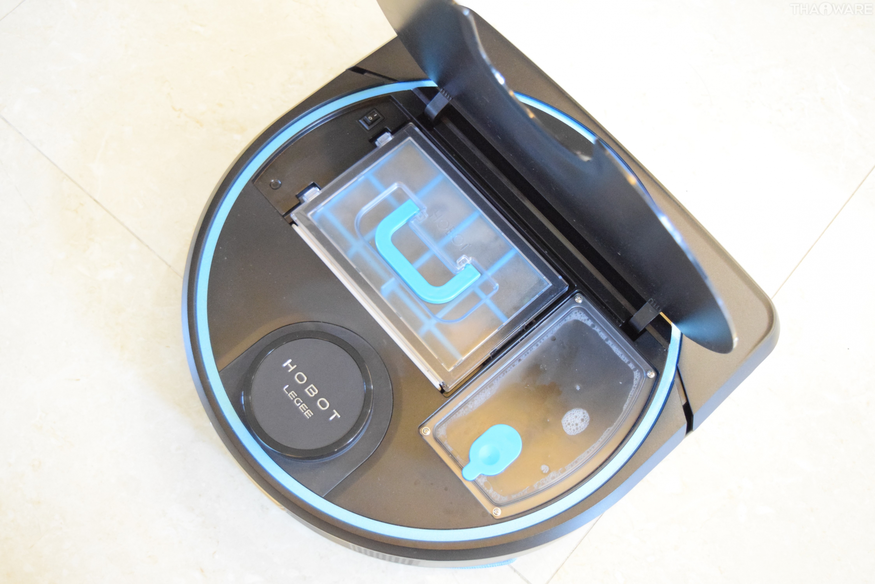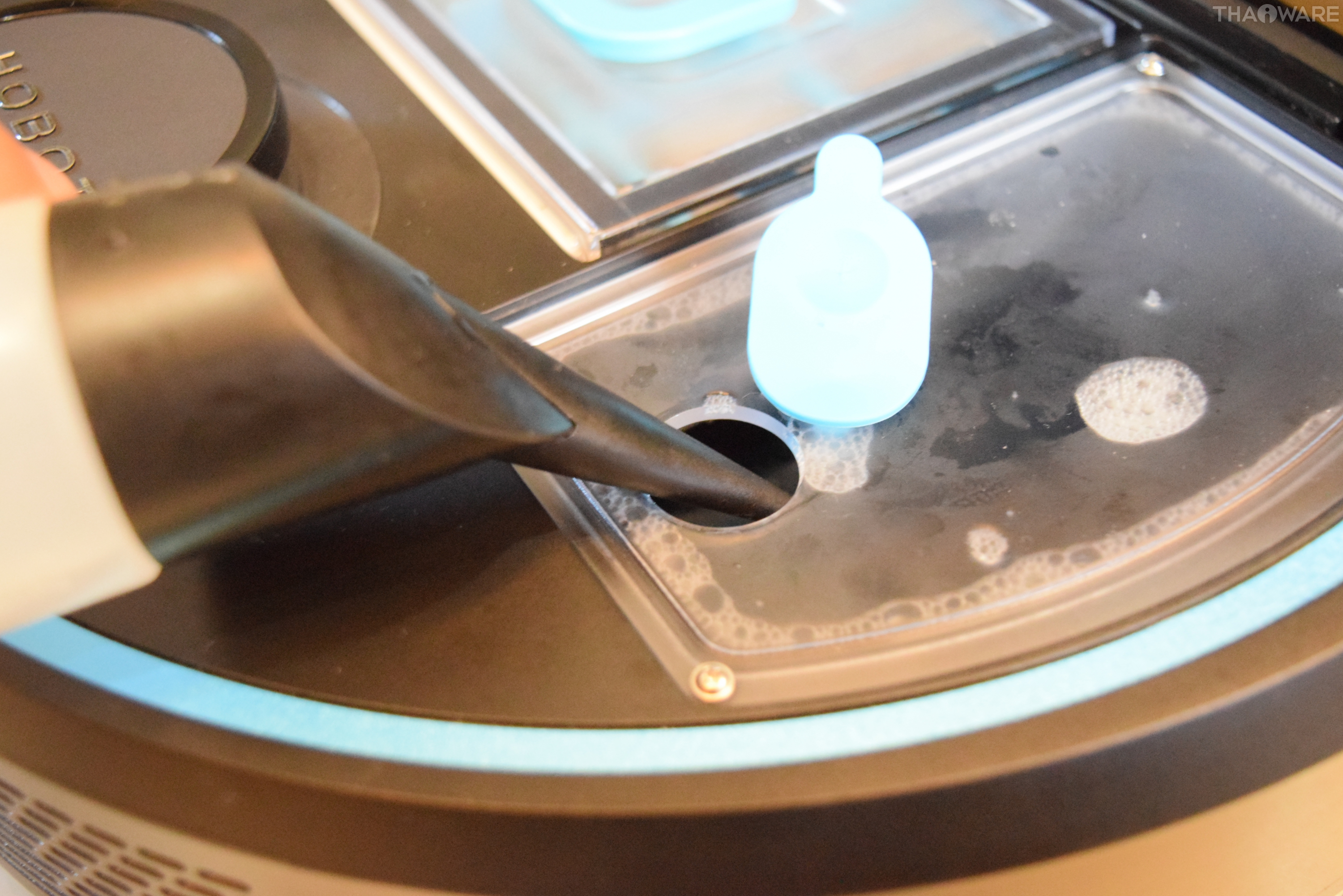 ข้าง ๆ ถังเก็บฝุ่น มีถังน้ำที่สามารถบรรจุน้ำ ได้ 340 มิลลิลิตร สามารถเติมน้ำในแทงค์ด้วยขวดหัวแหลมที่แถมมากับเครื่อง โดยเปิดฝาที่หัวแทงค์ออกเติมแล้วปิดให้สนิท นอกจากนี้ด้วยความที่รุ่นนี้มีโหมดขัดเงาด้วย เราสามารถเติมน้ำยาขัดลงไปด้วยอัตราส่วน 1/5 ของน้ำ เพื่อขัดพื้นบ้านให้เงางามได้ ซึ่งจะรองรับการขัดทุกสภาพผิว เช่น พื้นไม้ กระเบื้อง หินอ่อน หรือ ลามิเนท เป็นต้น ส่วนน้ำยาสามารถซื้อแยกได้ในราคา 299 บาท