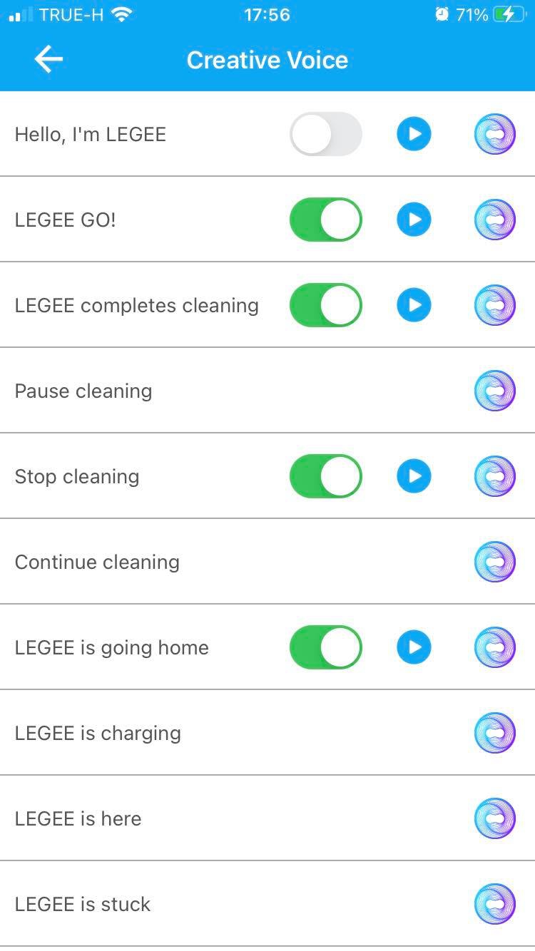 โดยปกติเสียงสถานะต่าง ๆ จะเซ็ตเป็นค่าเริ่มต้นอยู่แล้ว วิธีคือ ต้องเข้าไปที่ Creative Voice จากภาพที่สองจะเห็น ตัวอย่าง "Hello l'm Legee" ซึ่งเป็นคำตอบรับของระบบตอนที่เราเปิดใช้งานครั้งแรก หรือ "LEGEE is going home" เป็นเสียงตอบรับเมื่อมันกำลังกลับที่ชาร์จ