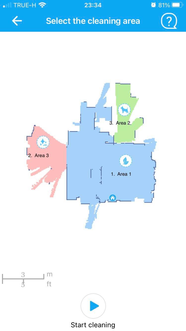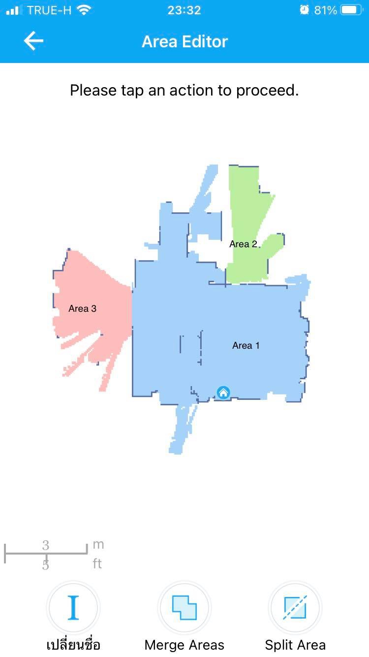 จะเห็นว่าระบบแบ่งเป็น 2 ส่วนอยู่แล้วตามพิกัดห้อง และถ้าต้องการแบ่งเพิ่มแค่เลือก Split Area และวาดเส้นกำหนดเอง หรือจะรวมห้องกลับมาก็เลือก Merge Areas กลับมารวมกันก็ได้ ส่วนในกรณีที่เราจะสั่งให้มันทำงานตามห้อง ก็แค่กลับไปหน้า Map Settings และเลือก Select The Cleaning Area จากนั้นเลือกโซน แล้วก็เลือกคำสั่งโหมดต่าง ๆ ต่อได้เลย